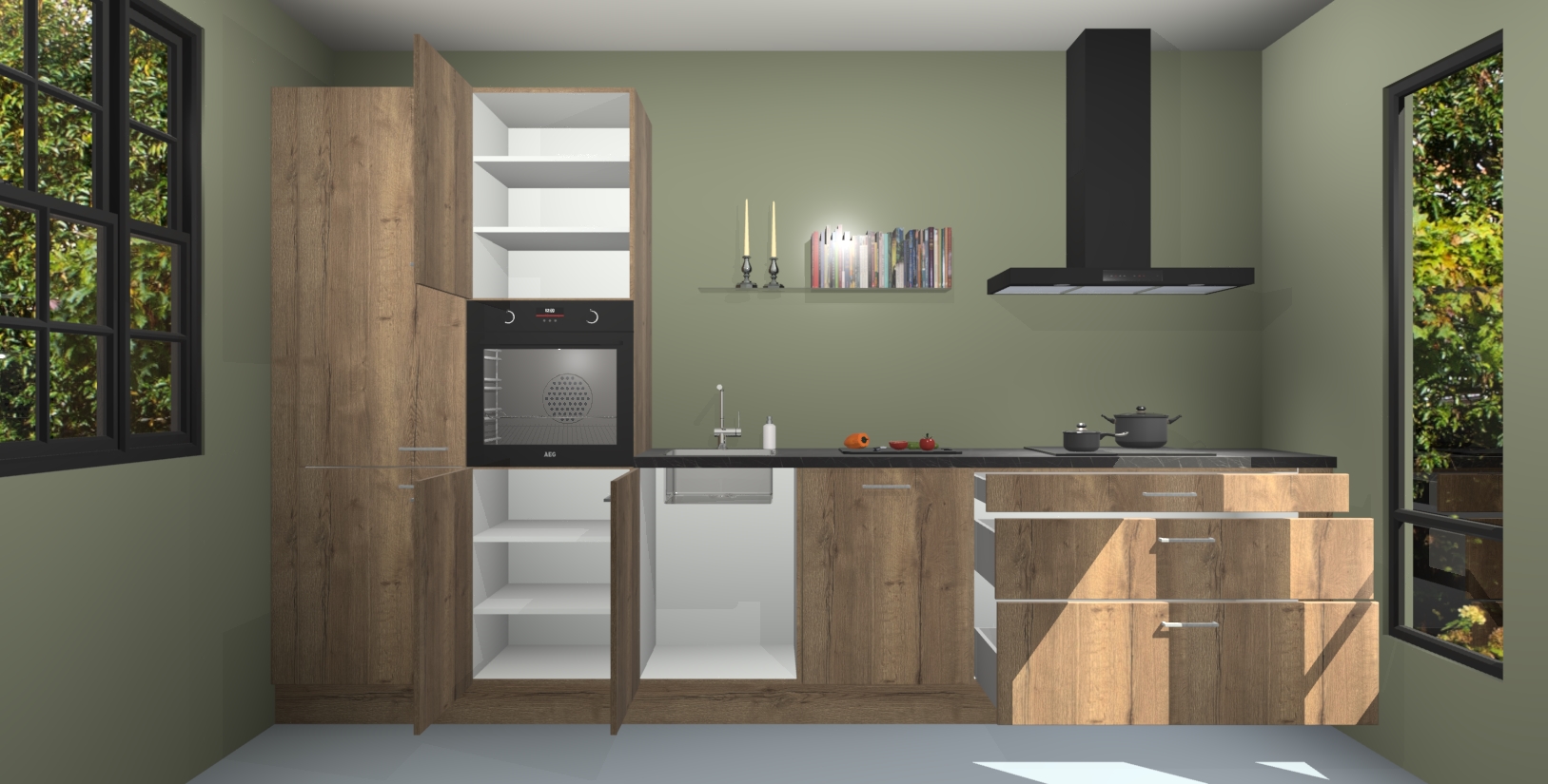 Deze keuken is ook ongelooflijk praktisch, met houten fronten die makkelijk schoon te maken zijn en zelf makkelijk te upgraden naar combimagnetron. De kasten zijn zelfs voor gemonteerd, dus u hoeft zich geen zorgen te maken over montage of installatie - u hoeft ze alleen maar op hun plaats te zetten!