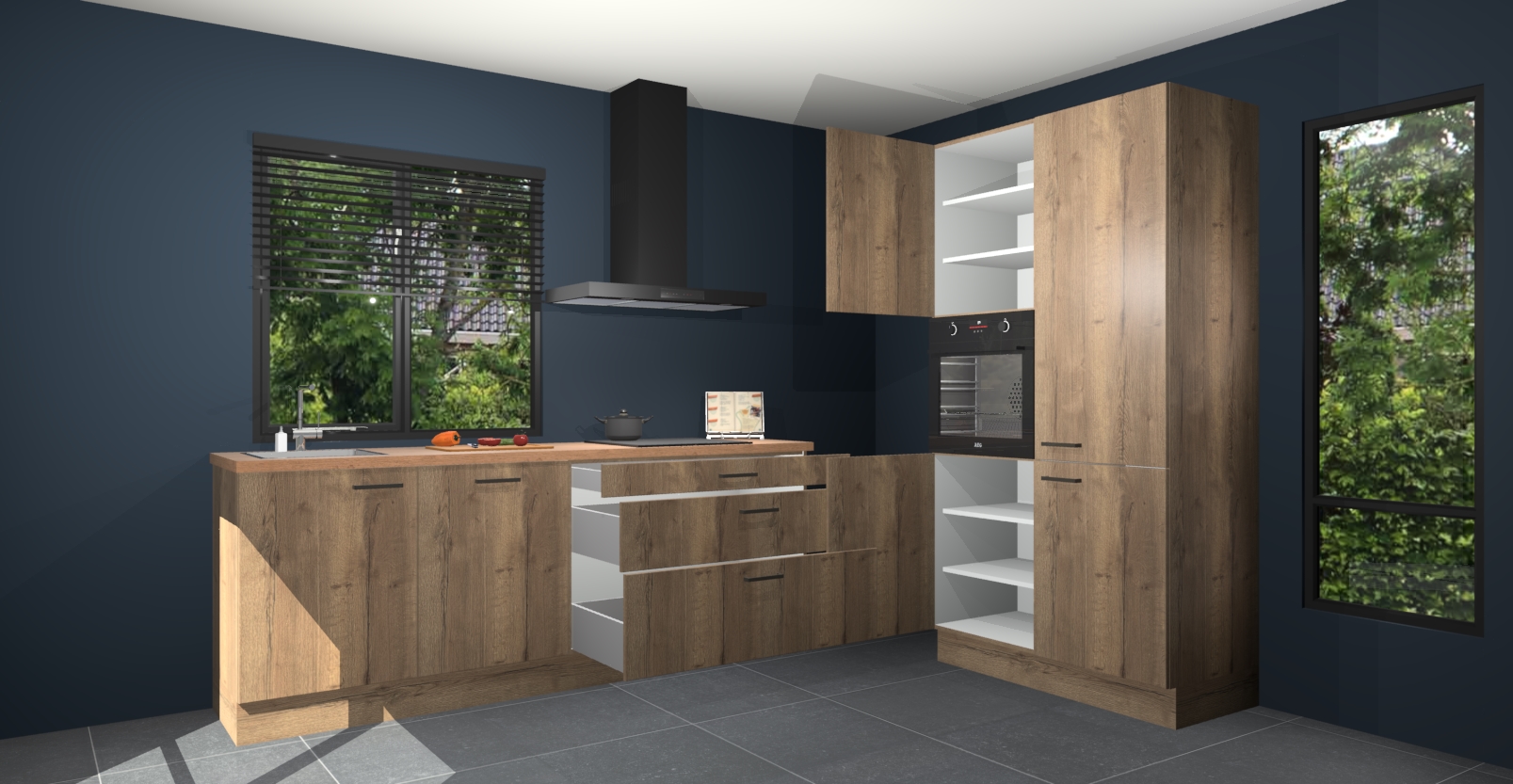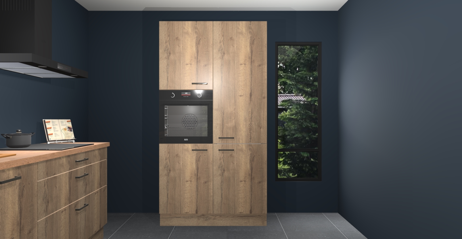 De setting is compleet gemaakt door de vijf inbouwapparaten: wanneer u gaat bestellen kunt u upgraden naar AEG-apparaten als oven, inductieplaat, afzuigkap, vaatwasser en koelkast. Kiest u voor onze Chocolade eiken keuken Monaco, dan weet u zeker dat u te maken heeft met Duitse kwaliteit. Bovendien is er altijd sprake van een lage prijs en profiteren we aantrekkelijk leveringstermijn: die bedraagt slechts 7 weken ! Om het extra makkelijk te maken worden de keukenkasten reeds voorgemonteerd geleverd.