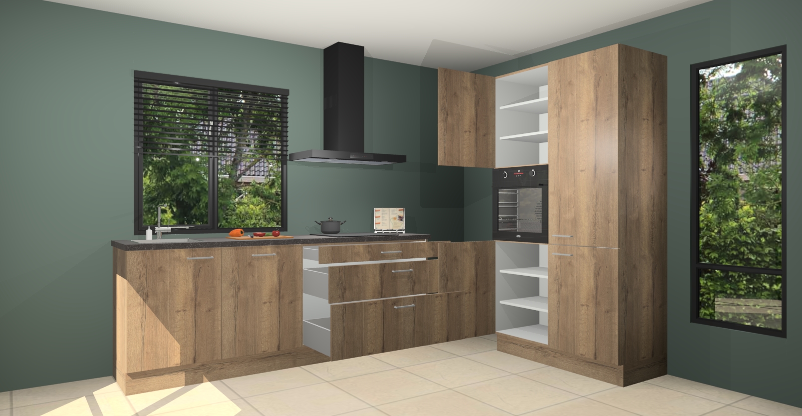 De setting is compleet gemaakt door de vijf inbouwapparaten: wanneer u gaat bestellen kunt u upgraden naar AEG-apparaten als oven, inductieplaat, afzuigkap, vaatwasser en koelkast. Kiest u voor onze Chocolade eiken keuken Monaco, dan weet u zeker dat u te maken heeft met Duitse kwaliteit. Bovendien is er altijd sprake van een lage prijs en profiteren we aantrekkelijk leveringstermijn: die bedraagt slechts 7 weken ! Om het extra makkelijk te maken worden de keukenkasten reeds voorgemonteerd geleverd.