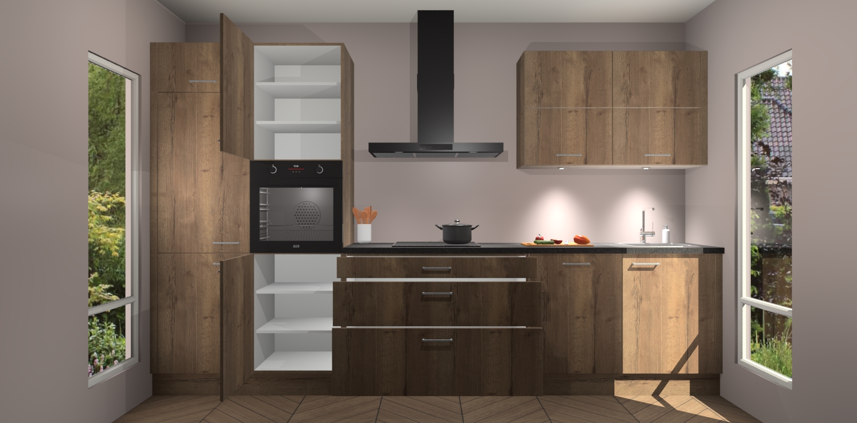 Maak kennis met de nieuwe Chocolade Eiken Keuken Parijs - de perfecte designcombinatie van gemak, moderne elegantie en ultramodern design. Met een gemakkelijk te reinigen Chocolade Eiken afwerking, zal de slankheid van deze keuken zeker een vleugje luxe toevoegen aan elke ruimte die hij inneemt.