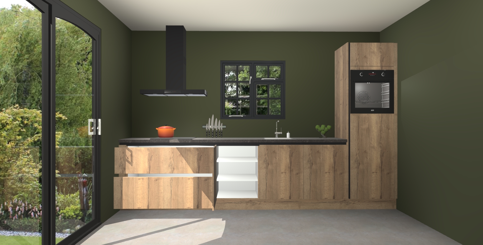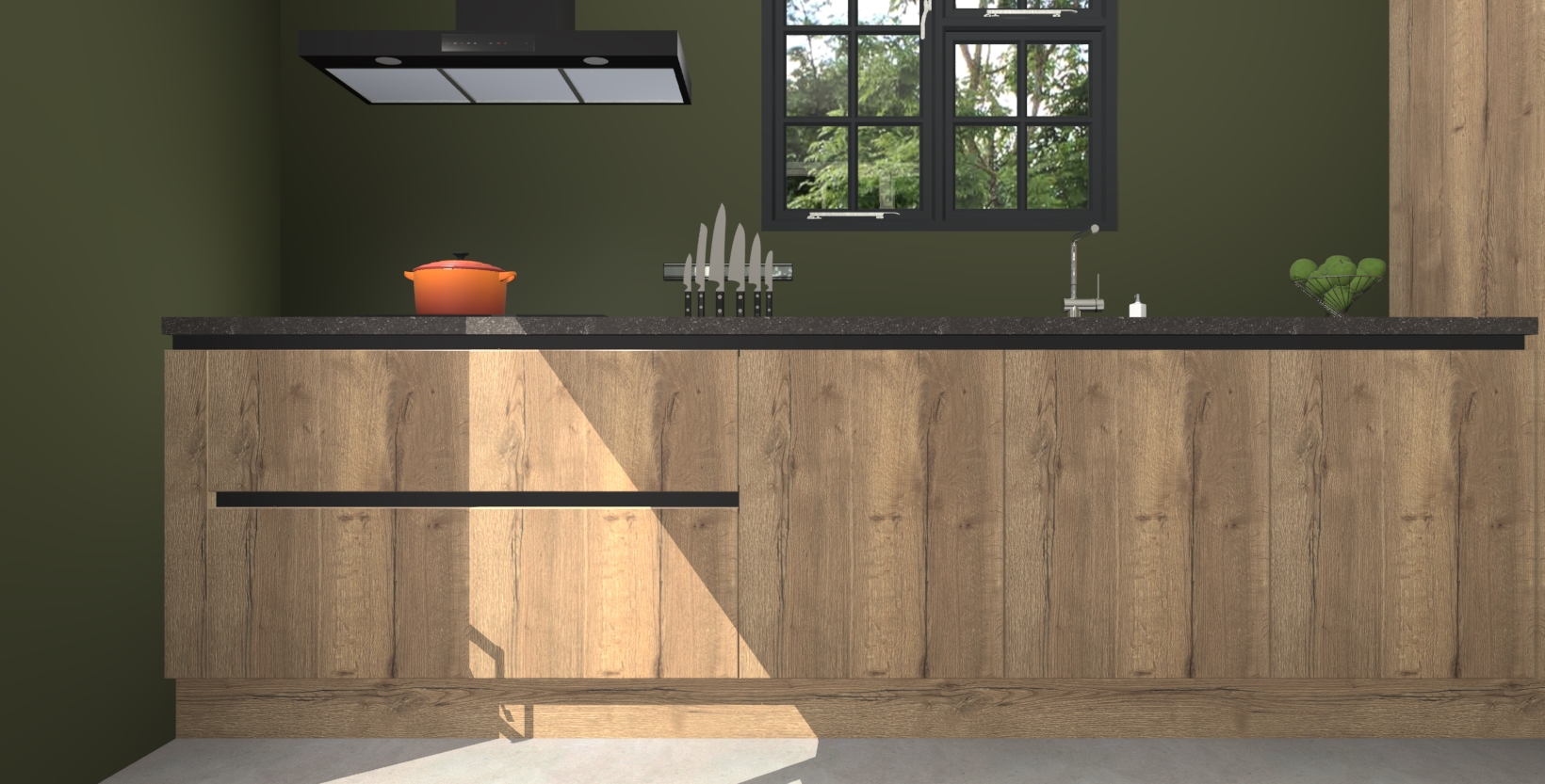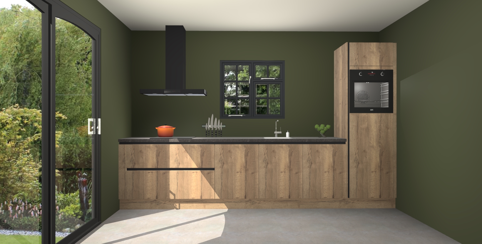 Maak kennis met de chocolade eiken keuken Sofia: de perfecte mix van stijl en gemak. De keuken heeft vijf inbouw apparaten, plus een werkblad in houtlook dat meteen warmte en verfijning toevoegt.