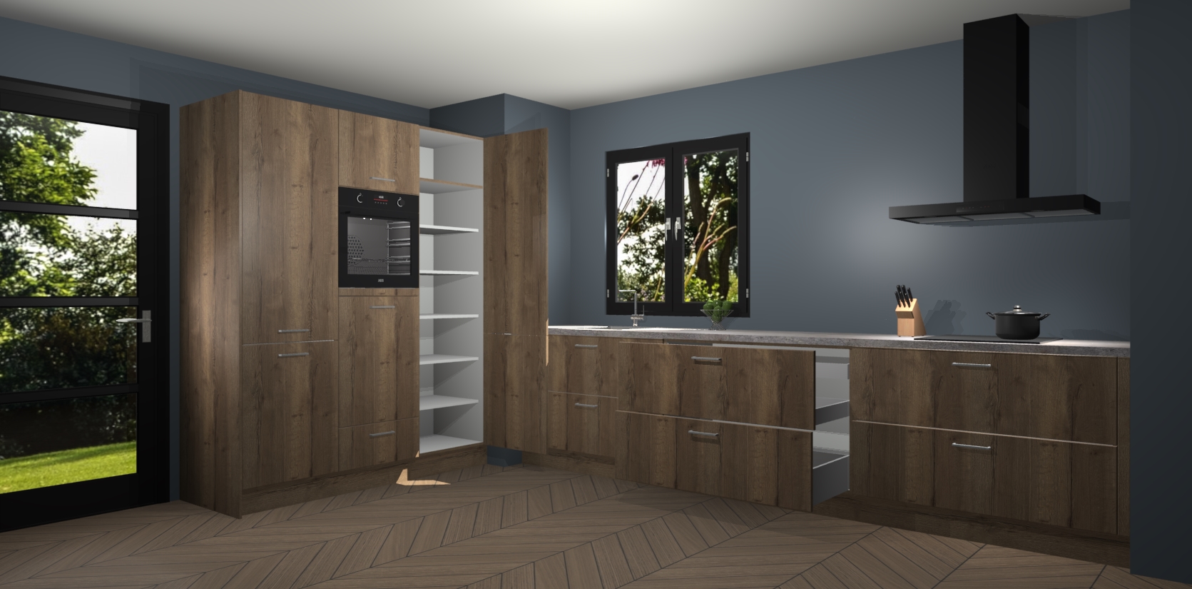 De softclose deuren openen en sluiten is ook heel eenvoudig - geniet van een moeiteloze keukenervaring, zelfs als er kinderen rondlopen. Voor extra gemak bij het plaatsen van uw bestelling bieden we ook een upgrade naar een kookplaat met geïntegreerde afzuiging.