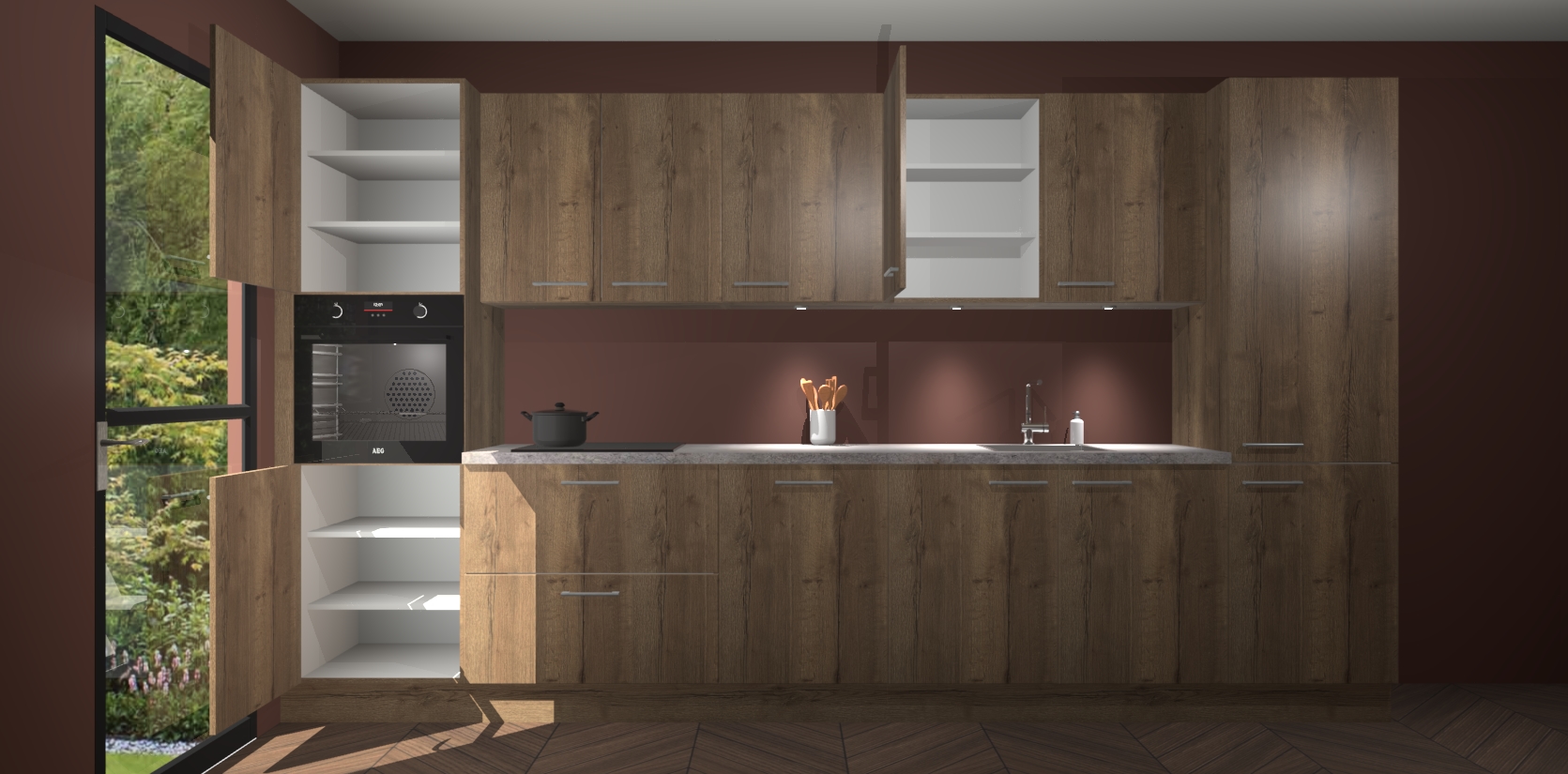 Dit is de perfecte keuken voor wie op zoek is naar een luxueuze stijl zonder zijn portemonnee te legen! Het chique ontwerp van de chocolade eiken keuken Wels voegt dat vleugje verfijning toe aan elk huis. Het gemak van voorgemonteerde kasten bespaart u talloze uren tijd en energie, zodat u veel sneller dan verwacht kunt beginnen te genieten van uw prachtige nieuwe keuken. Bovendien bedraagt de levertijd slechts 7 weken.