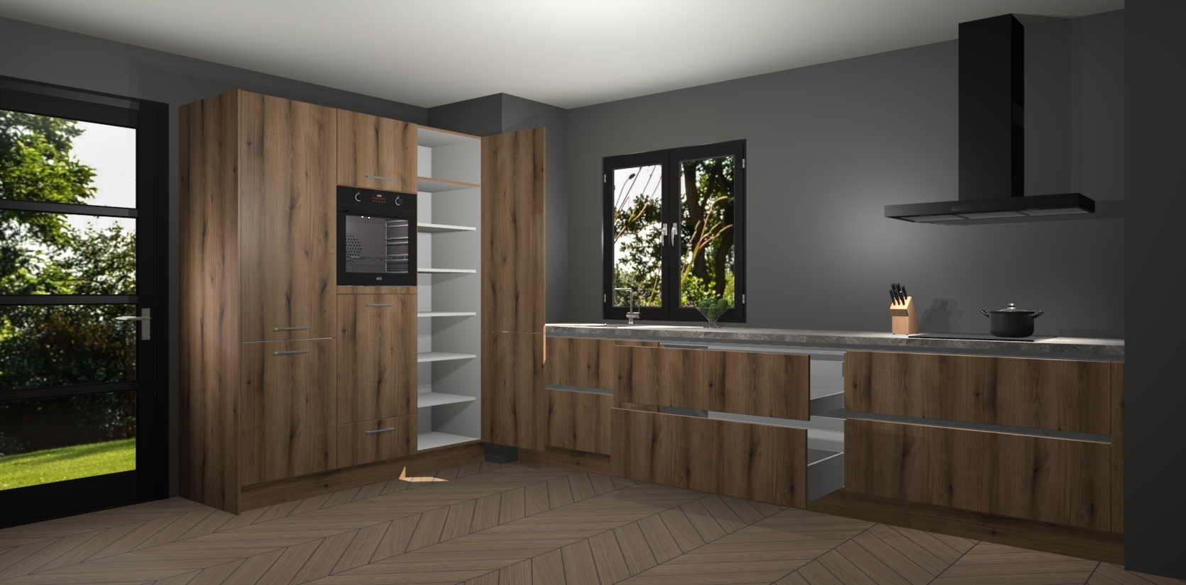 De softclose deuren openen en sluiten is ook heel eenvoudig - geniet van een moeiteloze keukenervaring, zelfs als er kinderen rondlopen. Voor extra gemak bij het plaatsen van uw bestelling bieden we ook een upgrade naar een kookplaat met geïntegreerde afzuiging.