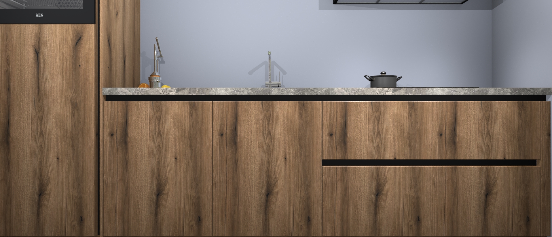 Maak kennis met de gloednieuwe Goud Eiken keuken Tokelau! Met zijn chique, moderne uitstraling is dit product perfect voor iedereen die een warm en toch strak design voor zijn huis wil.
