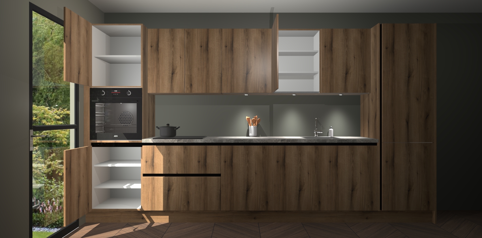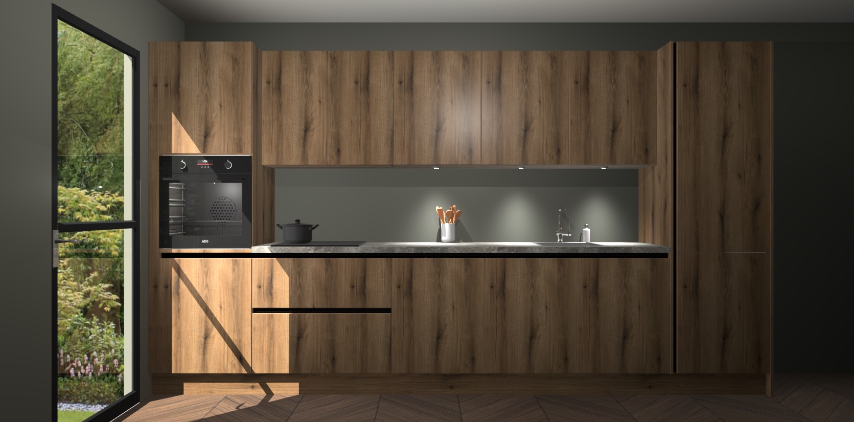 Dit is de perfecte keuken voor wie op zoek is naar een luxueuze stijl zonder zijn portemonnee te legen! Het chique ontwerp van de goud eiken greeploze keuken Wels voegt dat vleugje verfijning toe aan elk huis. Het gemak van voorgemonteerde kasten bespaart u talloze uren tijd en energie, zodat u veel sneller dan verwacht kunt beginnen te genieten van uw prachtige nieuwe keuken. Bovendien bedraagt de levertijd slechts 7 weken.