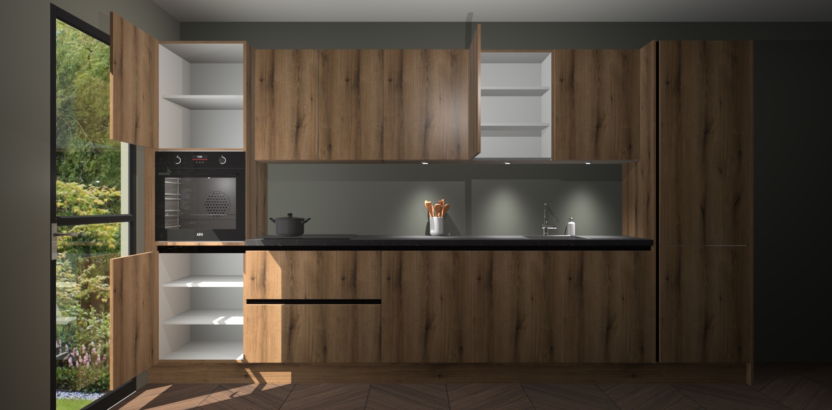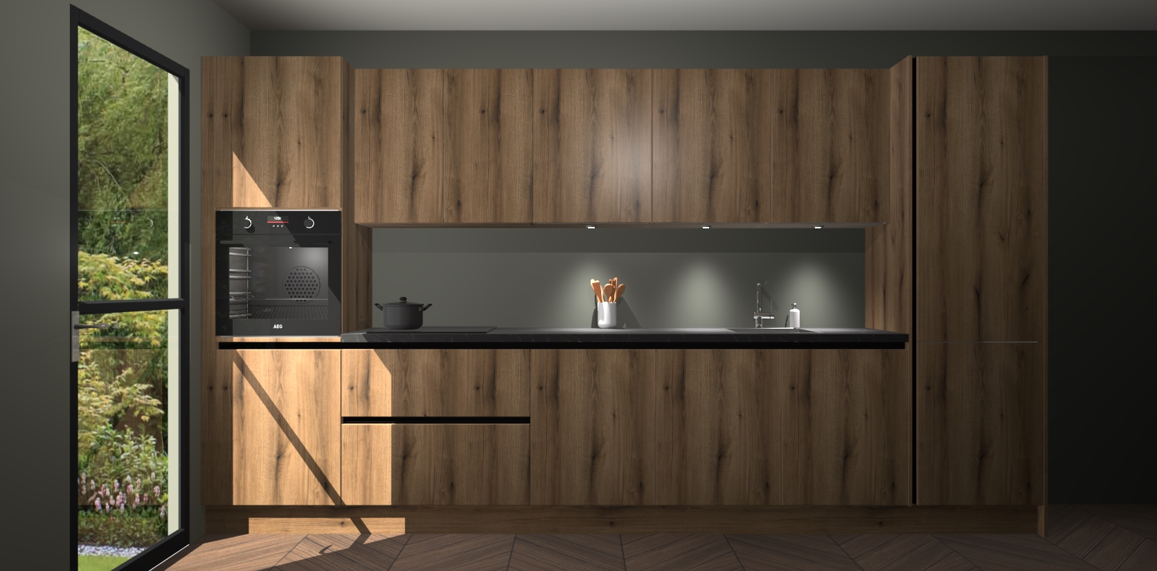 Dit is de perfecte keuken voor wie op zoek is naar een luxueuze stijl zonder zijn portemonnee te legen! Het chique ontwerp van de goud eiken greeploze keuken Wels voegt dat vleugje verfijning toe aan elk huis. Het gemak van voorgemonteerde kasten bespaart u talloze uren tijd en energie, zodat u veel sneller dan verwacht kunt beginnen te genieten van uw prachtige nieuwe keuken. Bovendien bedraagt de levertijd slechts 7 weken.