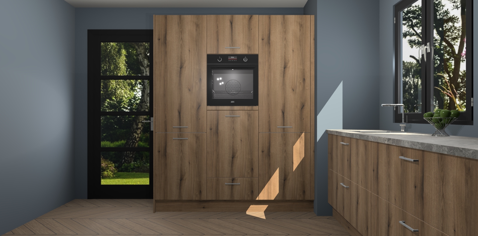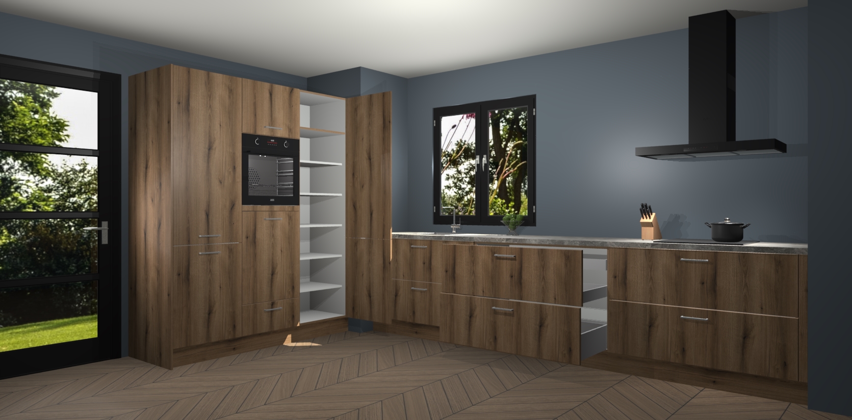 De softclose deuren openen en sluiten is ook heel eenvoudig - geniet van een moeiteloze keukenervaring, zelfs als er kinderen rondlopen. Voor extra gemak bij het plaatsen van uw bestelling bieden we ook een upgrade naar een kookplaat met geïntegreerde afzuiging.