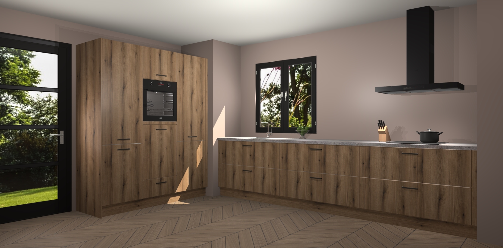 De softclose deuren openen en sluiten is ook heel eenvoudig - geniet van een moeiteloze keukenervaring, zelfs als er kinderen rondlopen. Voor extra gemak bij het plaatsen van uw bestelling bieden we ook een upgrade naar een kookplaat met geïntegreerde afzuiging.