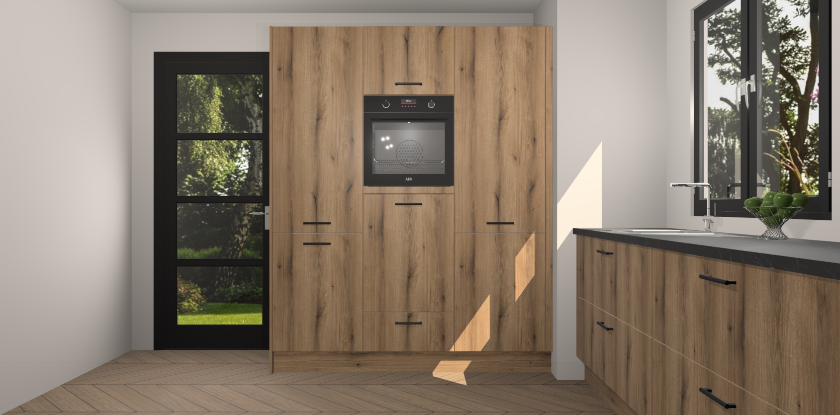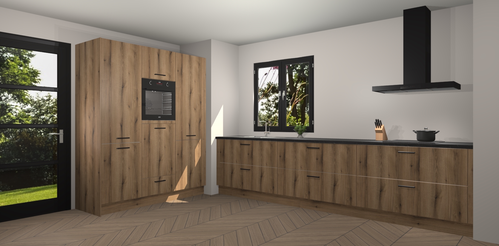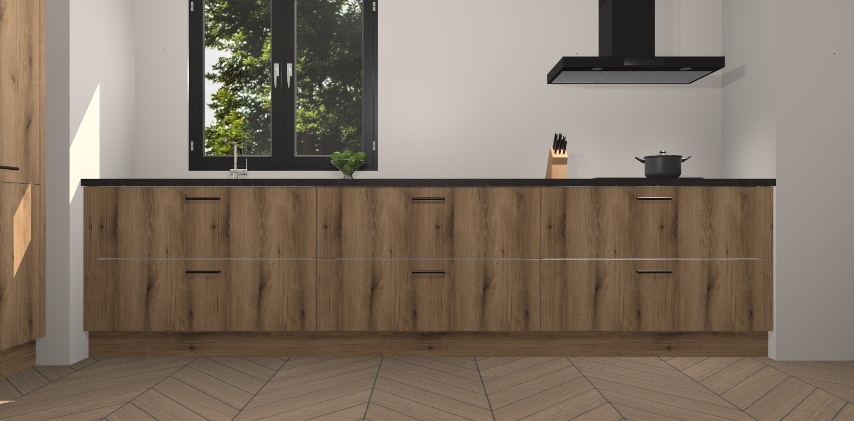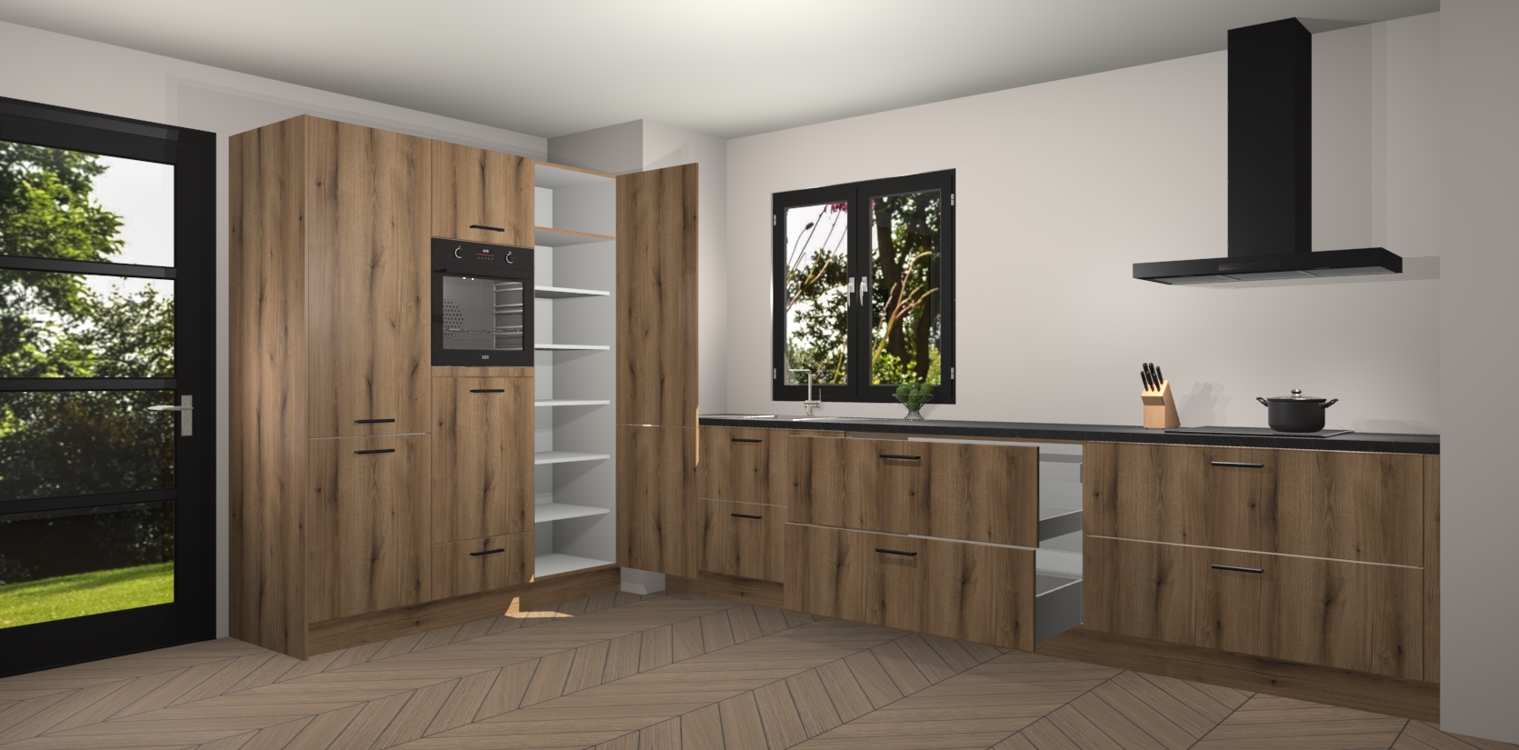 De softclose deuren openen en sluiten is ook heel eenvoudig - geniet van een moeiteloze keukenervaring, zelfs als er kinderen rondlopen. Voor extra gemak bij het plaatsen van uw bestelling bieden we ook een upgrade naar een kookplaat met geïntegreerde afzuiging.