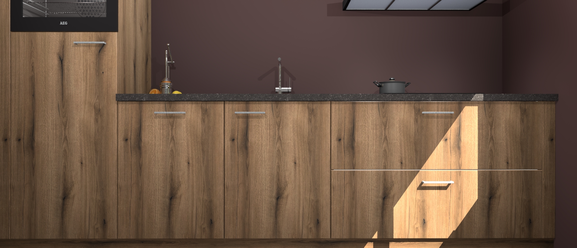 Maak kennis met de gloednieuwe Goud Eiken keuken Tokelau! Met zijn chique, moderne uitstraling is dit product perfect voor iedereen die een warm en toch strak design voor zijn huis wil.