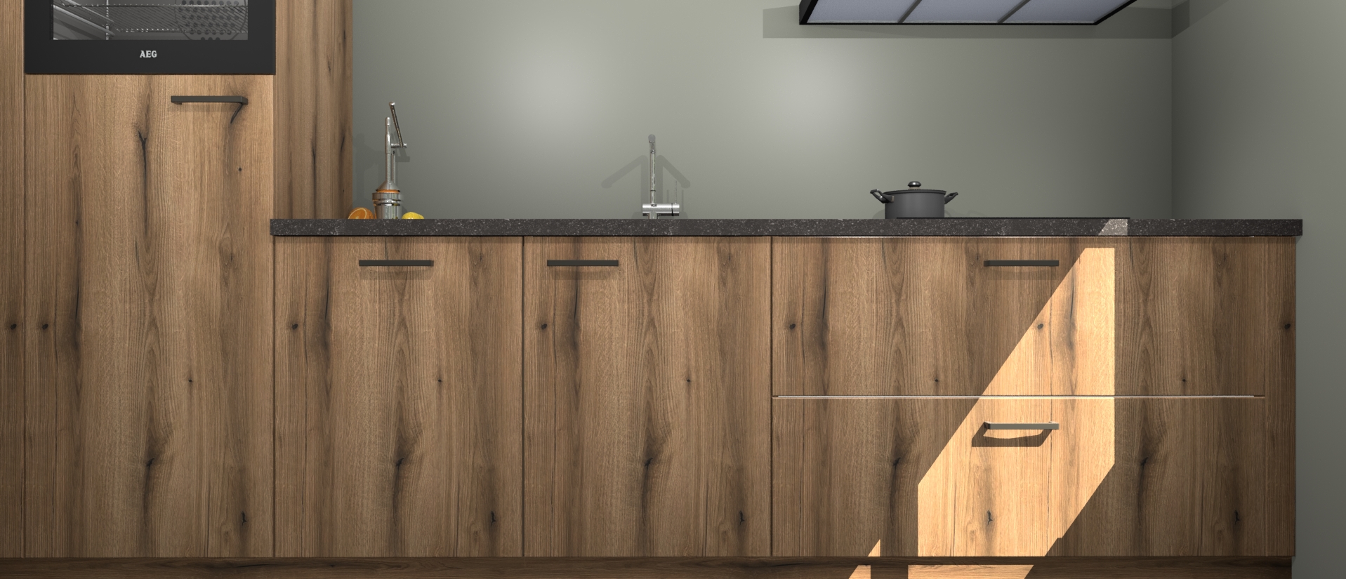 Maak kennis met de gloednieuwe Goud Eiken keuken Tokelau! Met zijn chique, moderne uitstraling is dit product perfect voor iedereen die een warm en toch strak design voor zijn huis wil.