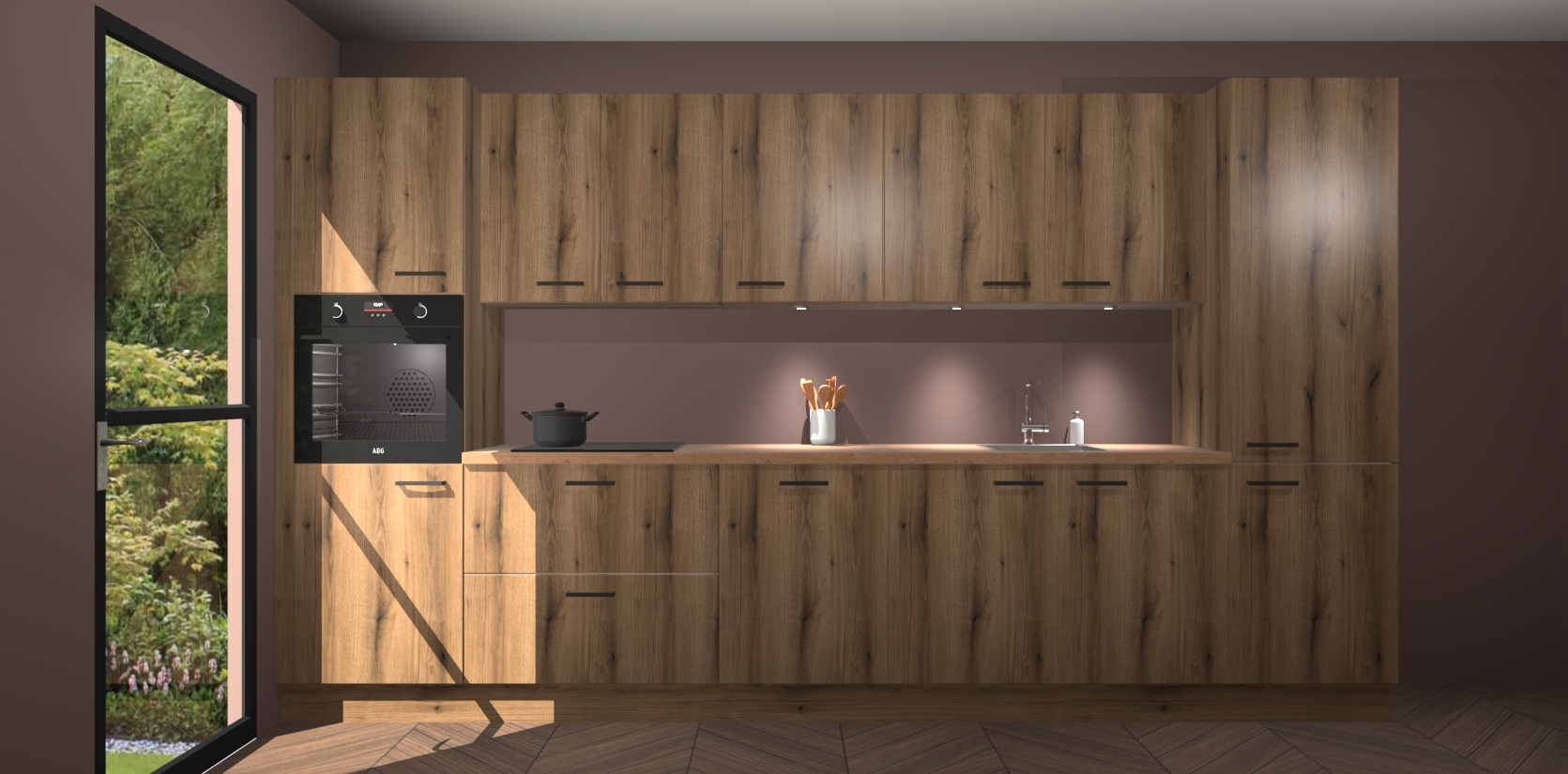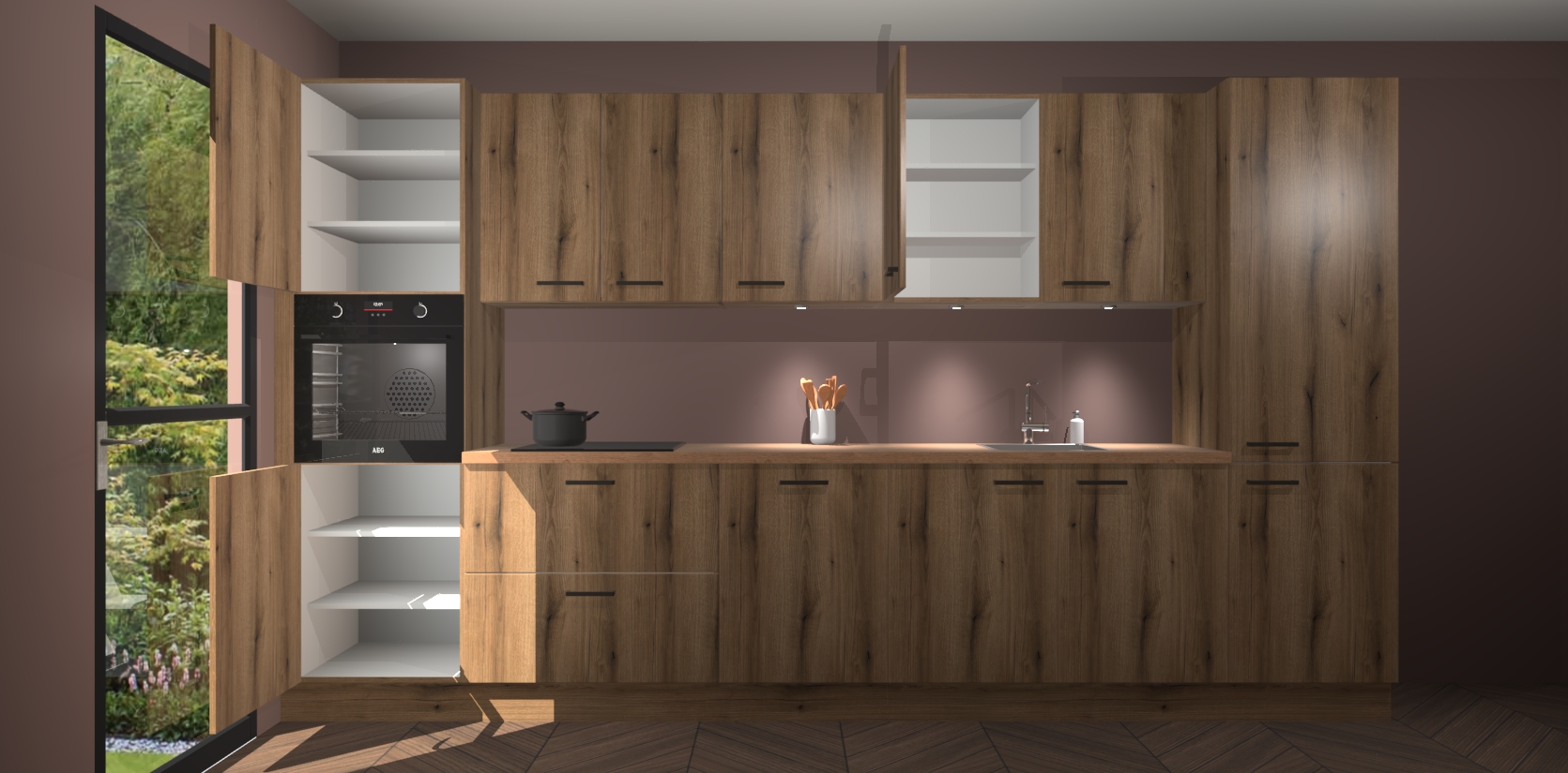 Dit is de perfecte keuken voor wie op zoek is naar een luxueuze stijl zonder zijn portemonnee te legen! Het chique ontwerp van de goud eiken keuken Wels voegt dat vleugje verfijning toe aan elk huis. Het gemak van voorgemonteerde kasten bespaart u talloze uren tijd en energie, zodat u veel sneller dan verwacht kunt beginnen te genieten van uw prachtige nieuwe keuken. Bovendien bedraagt de levertijd slechts 7 weken.