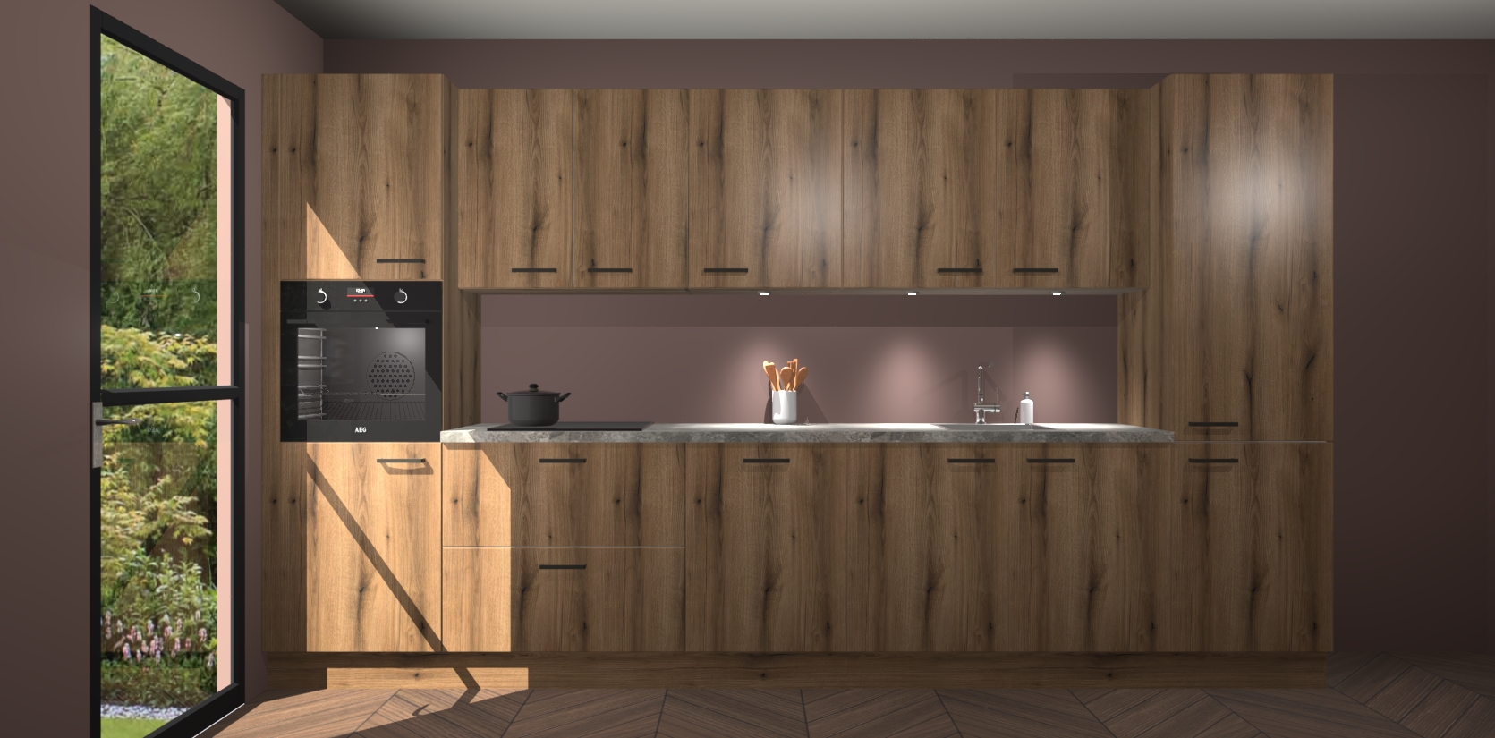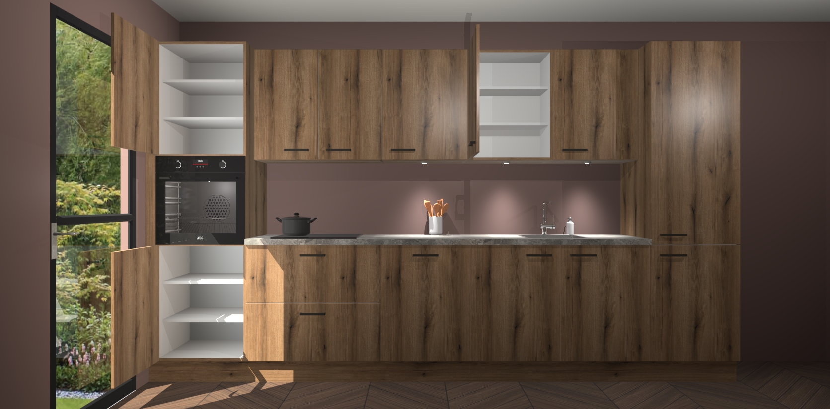 Dit is de perfecte keuken voor wie op zoek is naar een luxueuze stijl zonder zijn portemonnee te legen! Het chique ontwerp van de goud eiken keuken Wels voegt dat vleugje verfijning toe aan elk huis. Het gemak van voorgemonteerde kasten bespaart u talloze uren tijd en energie, zodat u veel sneller dan verwacht kunt beginnen te genieten van uw prachtige nieuwe keuken. Bovendien bedraagt de levertijd slechts 7 weken.