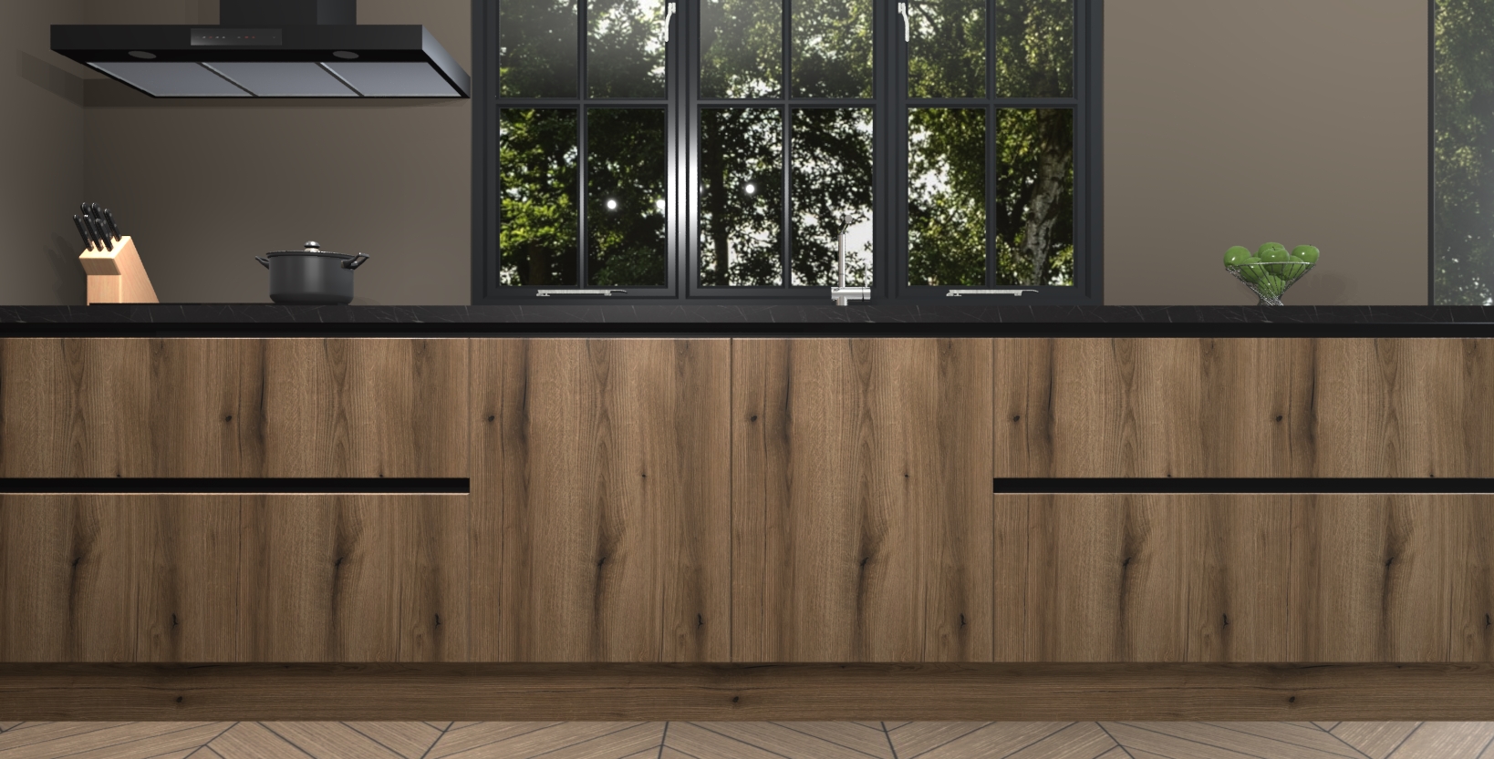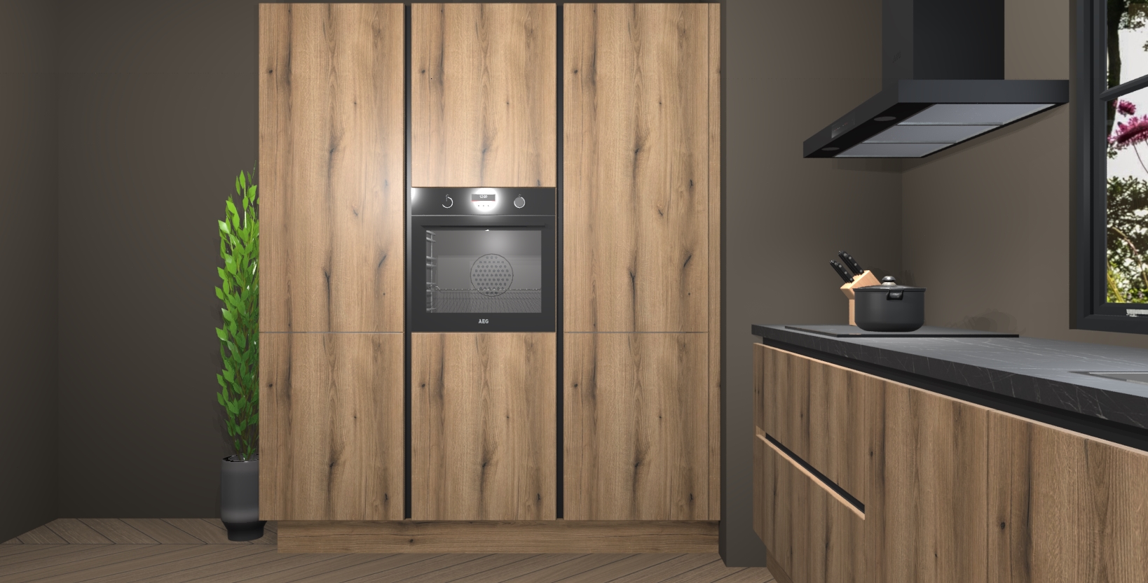 De softclose deuren openen en sluiten is ook heel eenvoudig - geniet van een moeiteloze keukenervaring, zelfs als er kinderen rondlopen. Voor extra gemak bij het plaatsen van uw bestelling bieden we ook een upgrade naar een kookplaat met geïntegreerde afzuiging.