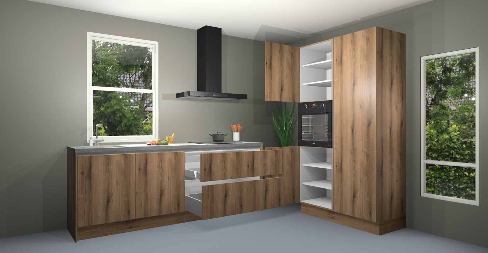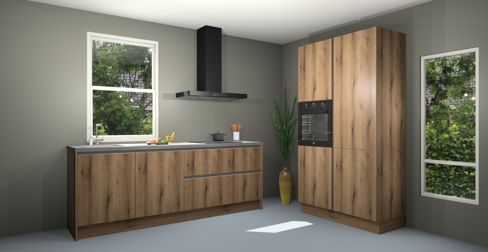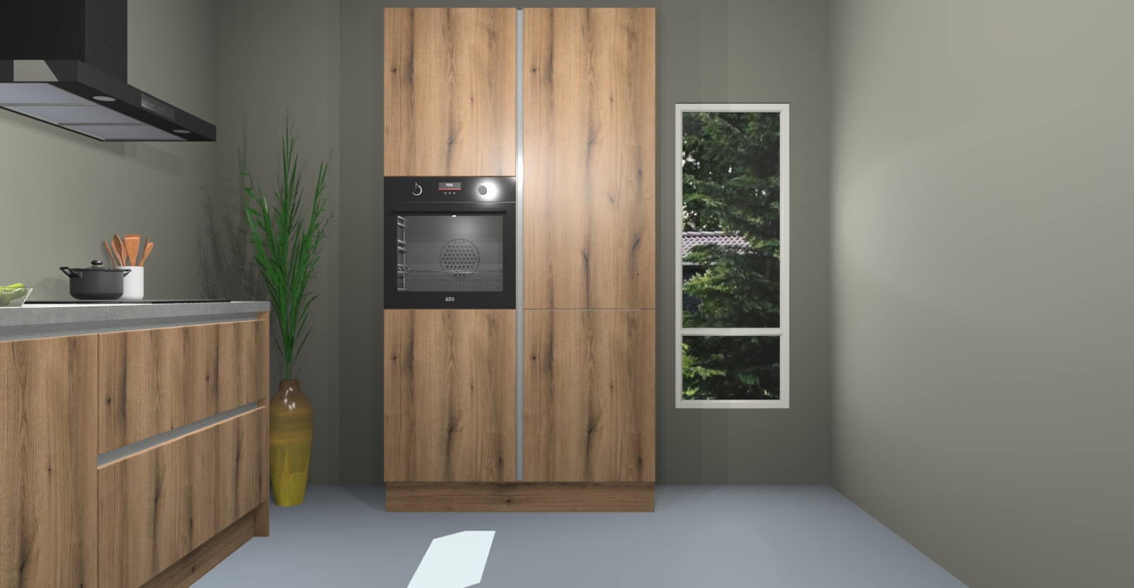 De Gouden eiken greeploze keuken Monaco heeft voldoende opbergruimte om uw keukenbenodigdheden georganiseerd en netjes te houden. Geniet van het gemak van de soft-close deuren, die deze stijlvolle look perfect afmaken. Maar dat is nog niet alles. Met de Gouden eiken greeploze keuken Monaco krijgt u maar liefst 5 ingebouwde apparaten: een oven, inductiekookplaat, afzuigkap, vaatwasser en koelkast. Deze kunnen gemakkelijk worden geüpgraded naar AEG als ze besteld zijn.