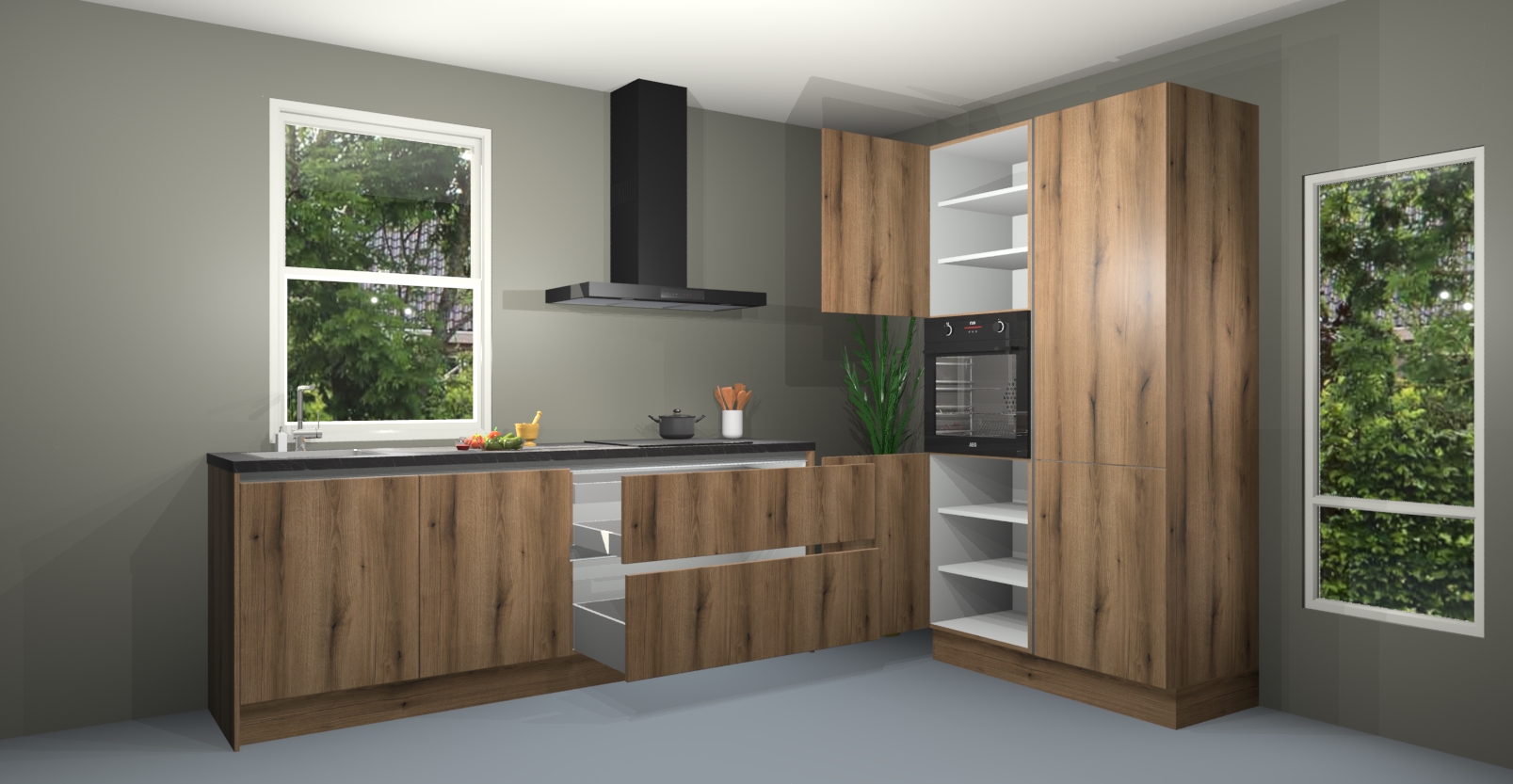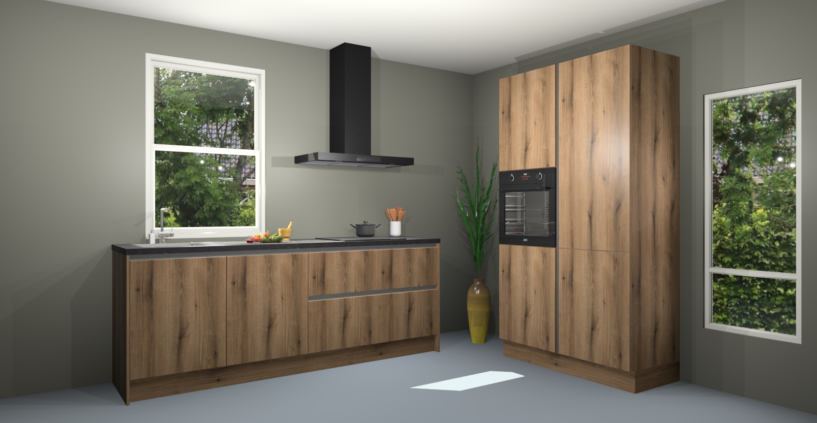 Ervaar het ultieme gevoel van warmte en gezelligheid in uw huis met de luxe Gouden eiken greeploze keuken Monaco! Deze ongelooflijk sfeervolle houtlook straalt heerlijke warmte uit en tovert elke keuken om tot een gezellig familiecentrum. Breng uw dromen tot leven met deze unieke keuken, ontworpen voor moeiteloze luxe en functionaliteit.