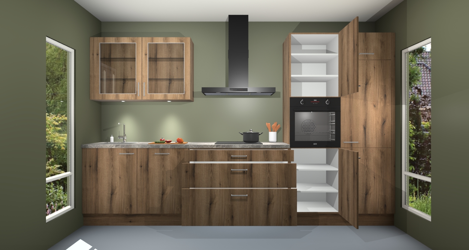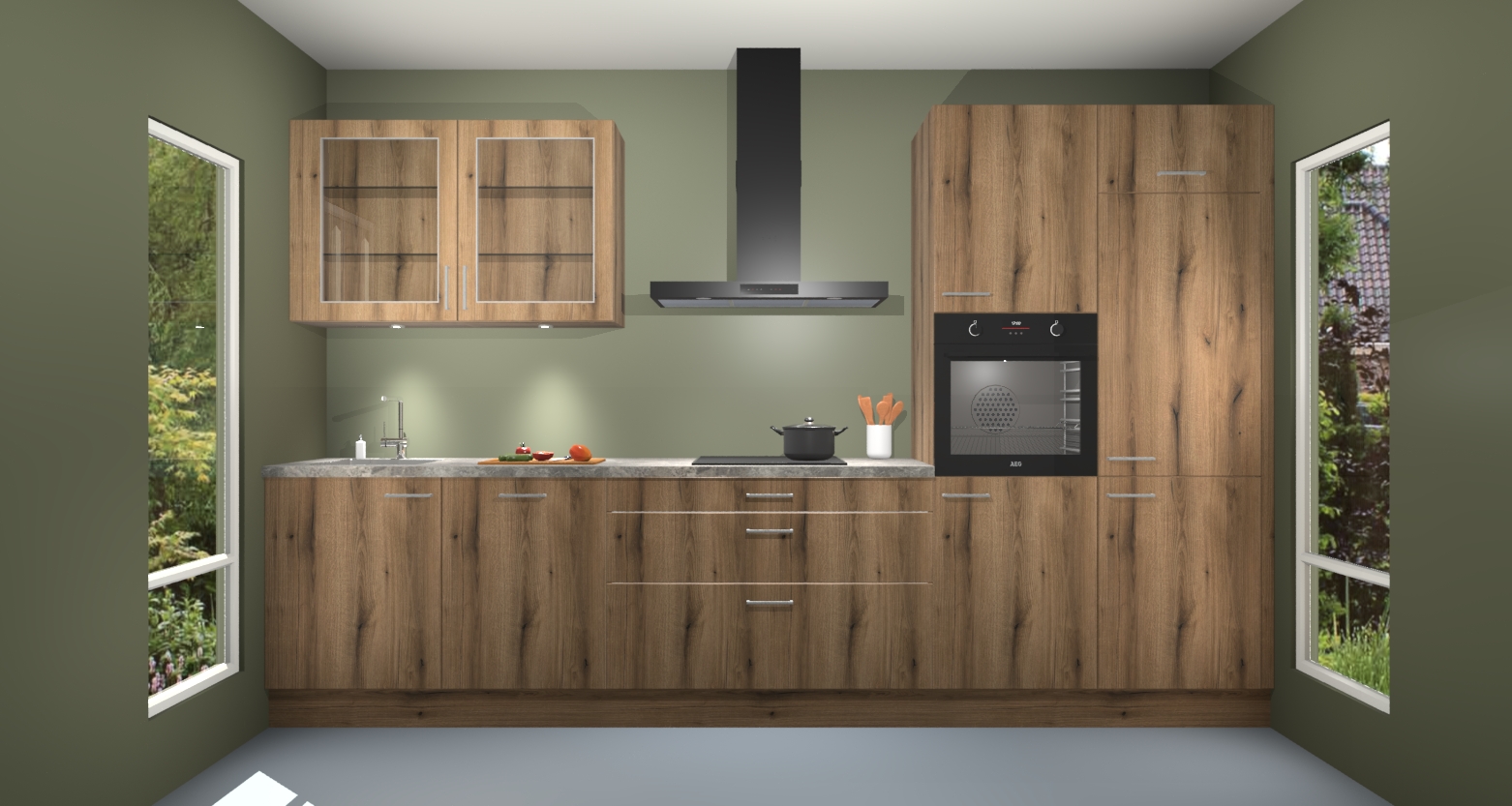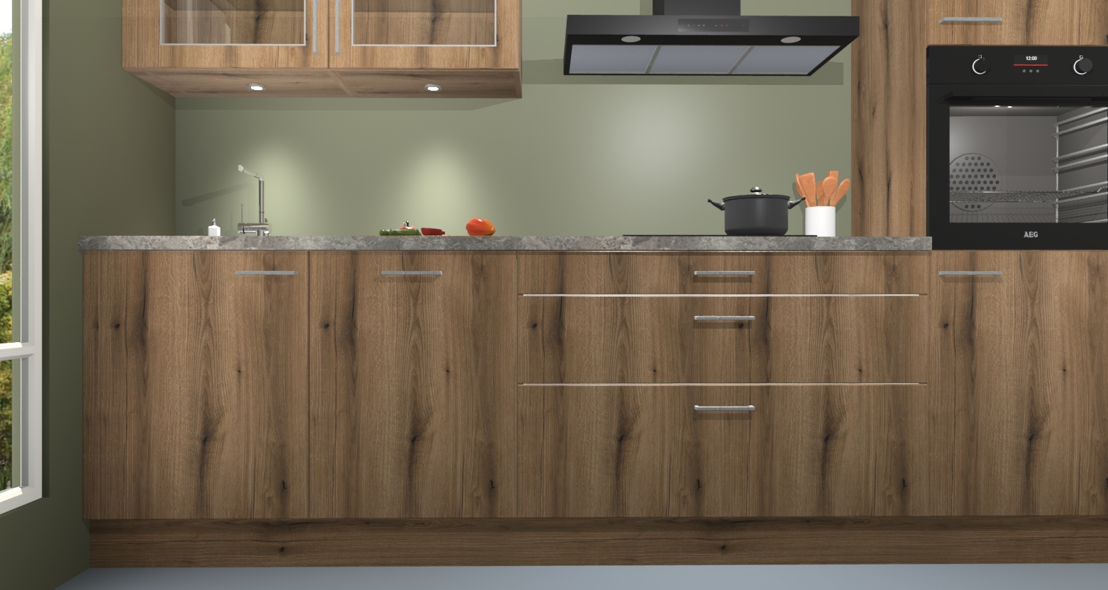 De gouden eiken keuken Cairo is de perfecte mix van modern en tijdloos design. Met zijn prachtige glazen deuren op de bovenkastjes voegt hij echt iets speciaals en unieks toe aan elke keuken. En met vijf ingebouwde apparaten inbegrepen - een oven, inductiekookplaat, afzuigkap, vaatwasser en koelkast - kunt u deze keuken echt helemaal van uzelf maken! U kunt na bestelling ook upgraden naar AEG voor een nog hogere kwaliteitservaring.