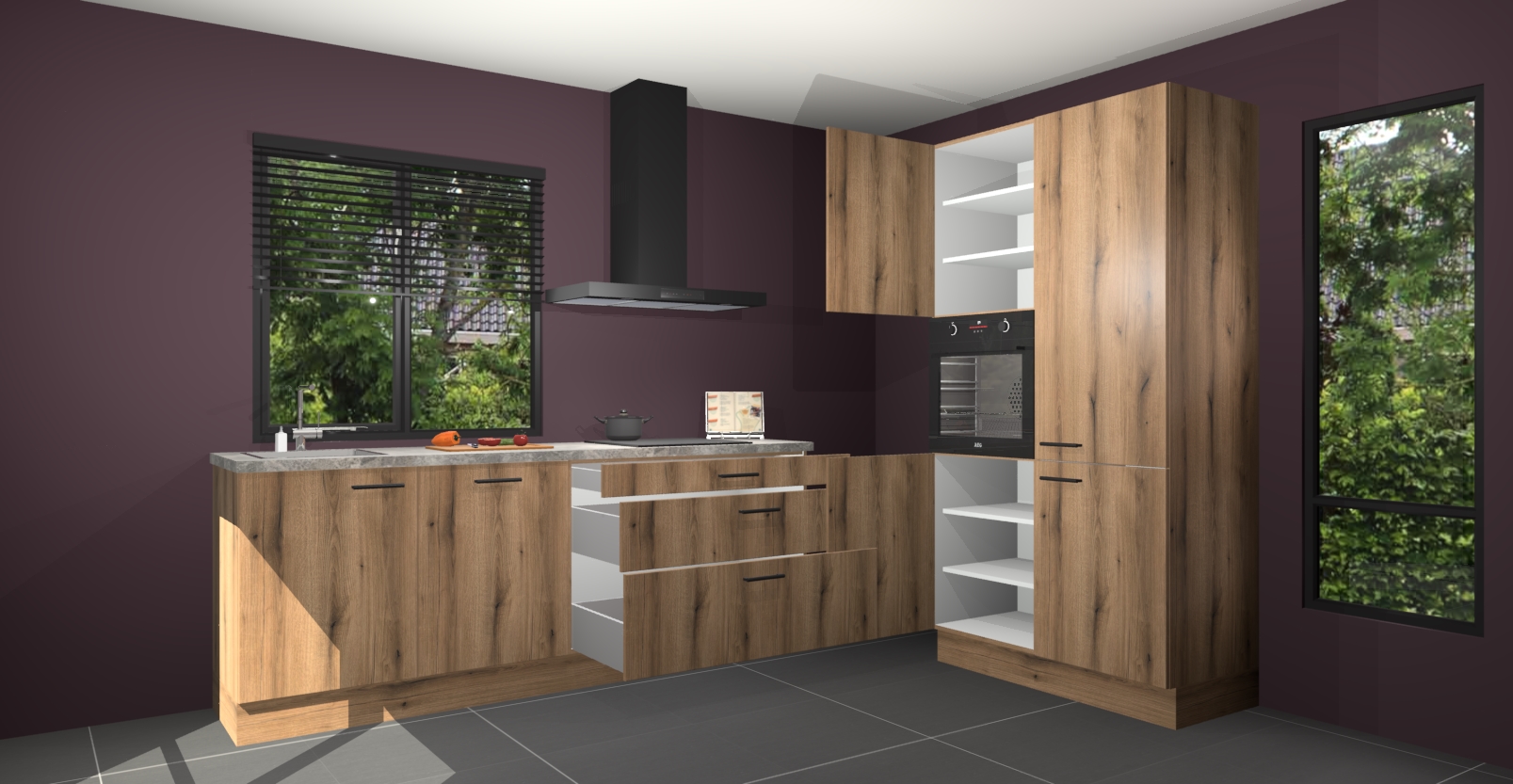 De setting is compleet gemaakt door de vijf inbouwapparaten: wanneer u gaat bestellen kunt u upgraden naar AEG-apparaten als oven, inductieplaat, afzuigkap, vaatwasser en koelkast. Kiest u voor onze Gouden eiken keuken Monaco, dan weet u zeker dat u te maken heeft met Duitse kwaliteit. Bovendien is er altijd sprake van een lage prijs en profiteren we aantrekkelijk leveringstermijn: die bedraagt slechts 7 weken ! Om het extra makkelijk te maken worden de keukenkasten reeds voorgemonteerd geleverd.