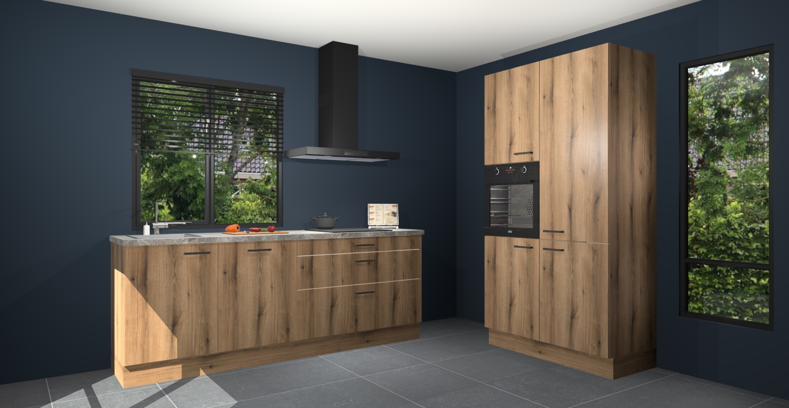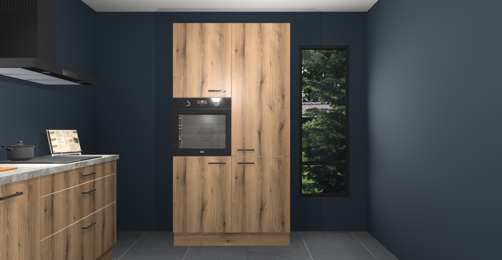 De setting is compleet gemaakt door de vijf inbouwapparaten: wanneer u gaat bestellen kunt u upgraden naar AEG-apparaten als oven, inductieplaat, afzuigkap, vaatwasser en koelkast. Kiest u voor onze Gouden eiken keuken Monaco, dan weet u zeker dat u te maken heeft met Duitse kwaliteit. Bovendien is er altijd sprake van een lage prijs en profiteren we aantrekkelijk leveringstermijn: die bedraagt slechts 7 weken ! Om het extra makkelijk te maken worden de keukenkasten reeds voorgemonteerd geleverd.
