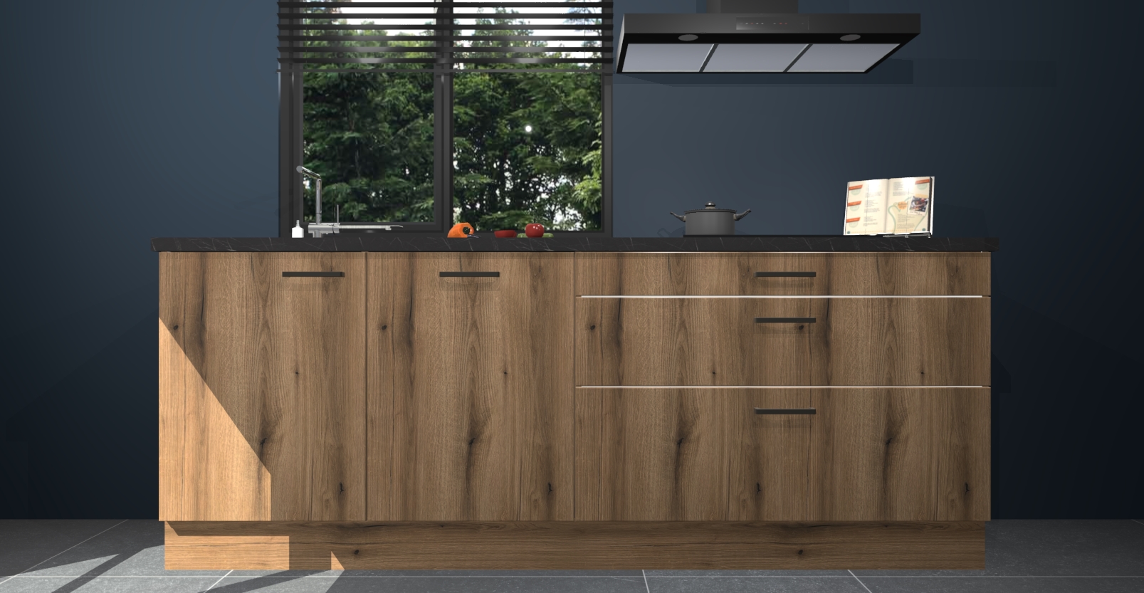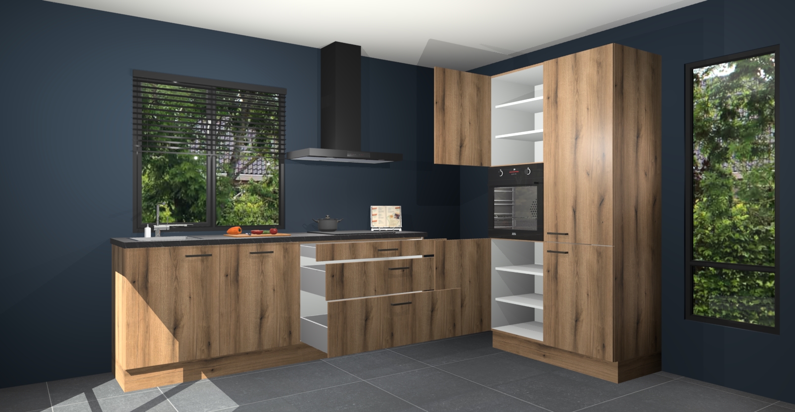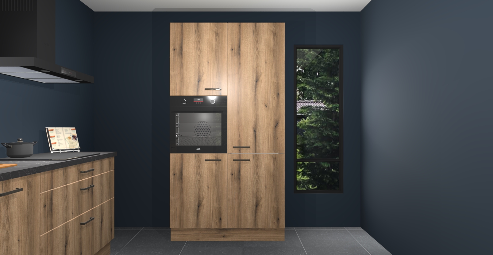 De setting is compleet gemaakt door de vijf inbouwapparaten: wanneer u gaat bestellen kunt u upgraden naar AEG-apparaten als oven, inductieplaat, afzuigkap, vaatwasser en koelkast. Kiest u voor onze Gouden eiken keuken Monaco, dan weet u zeker dat u te maken heeft met Duitse kwaliteit. Bovendien is er altijd sprake van een lage prijs en profiteren we aantrekkelijk leveringstermijn: die bedraagt slechts 7 weken ! Om het extra makkelijk te maken worden de keukenkasten reeds voorgemonteerd geleverd.