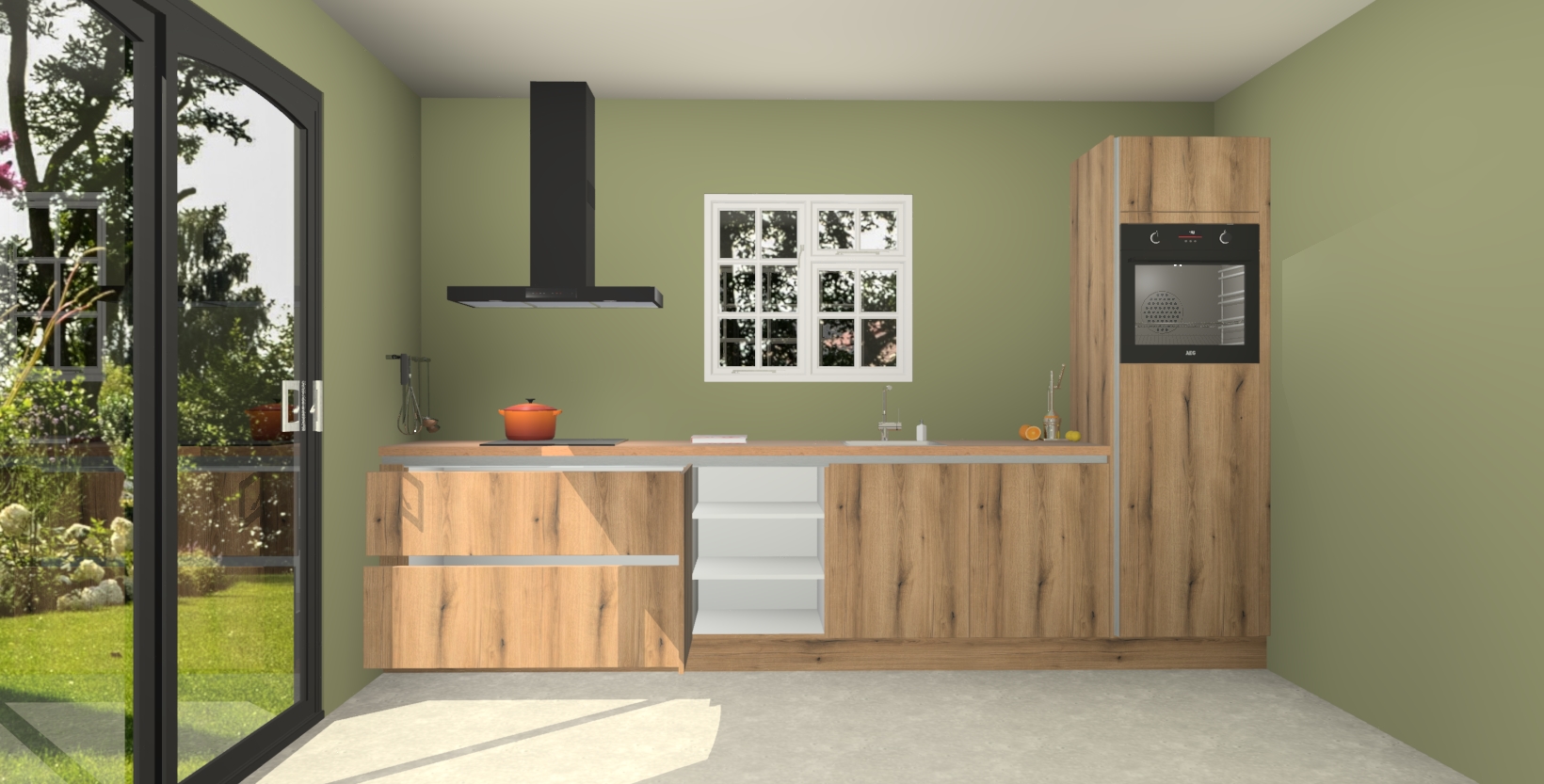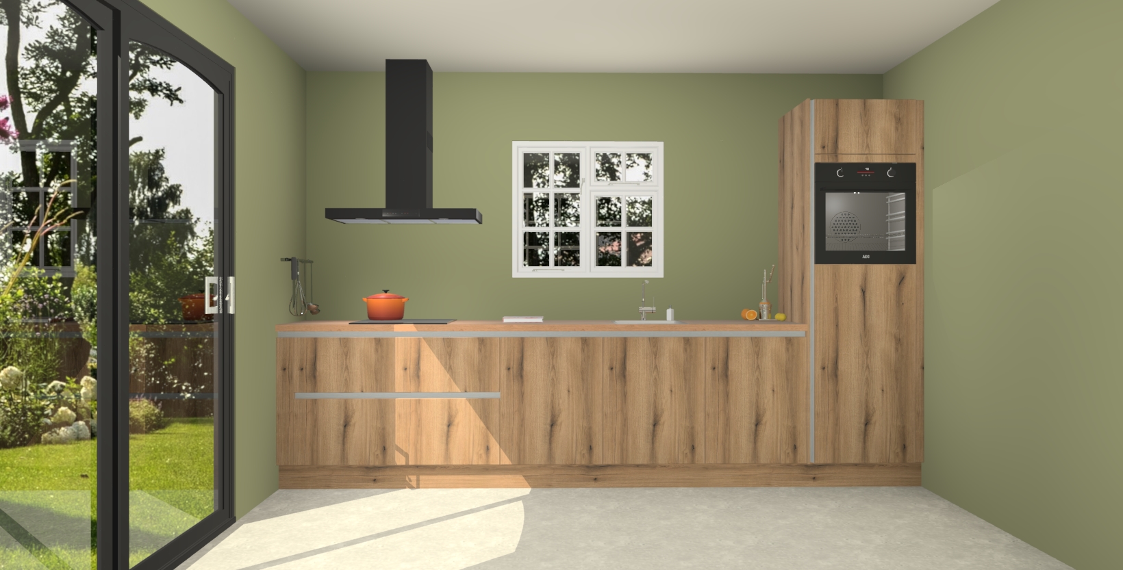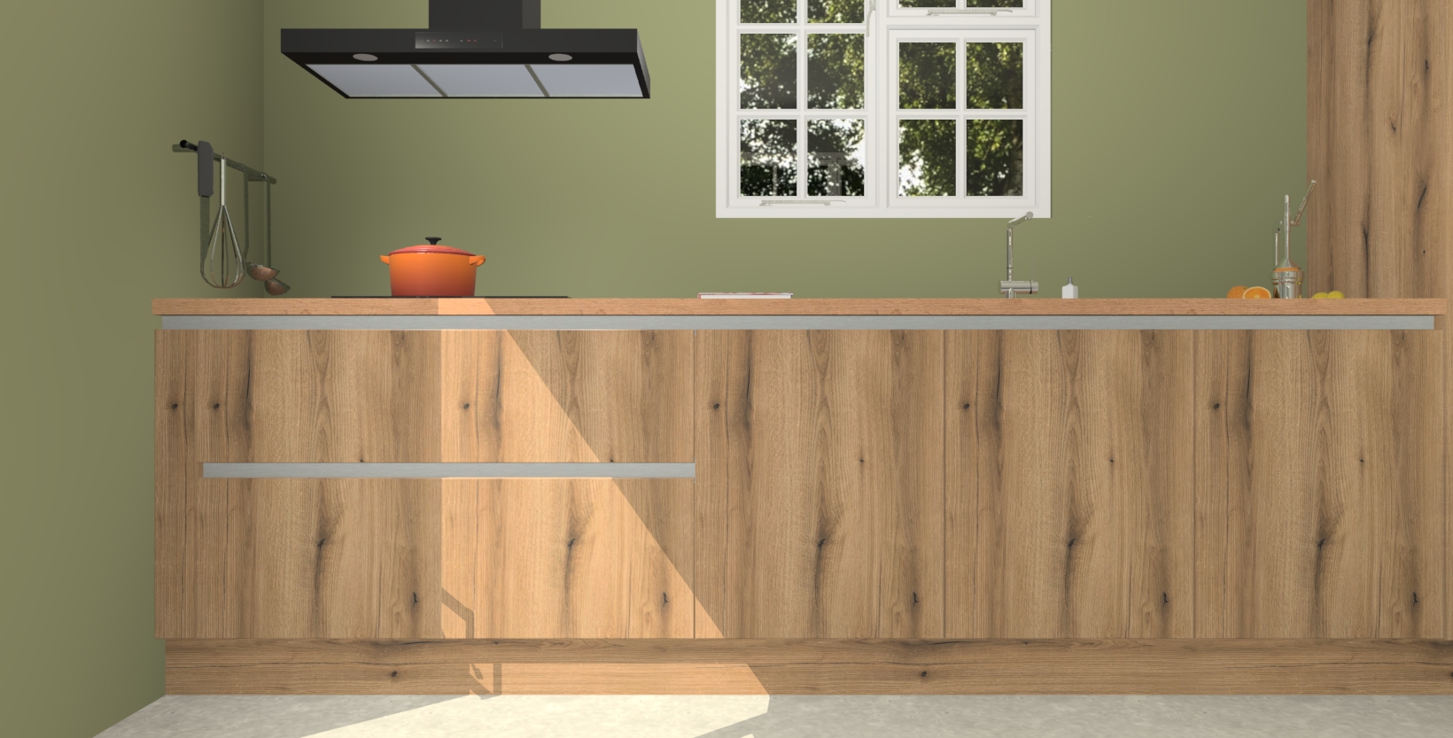 Maak kennis met de gouden eiken keuken Sofia: de perfecte mix van stijl en gemak. De keuken heeft vijf inbouw apparaten, plus een werkblad in houtlook dat meteen warmte en verfijning toevoegt.