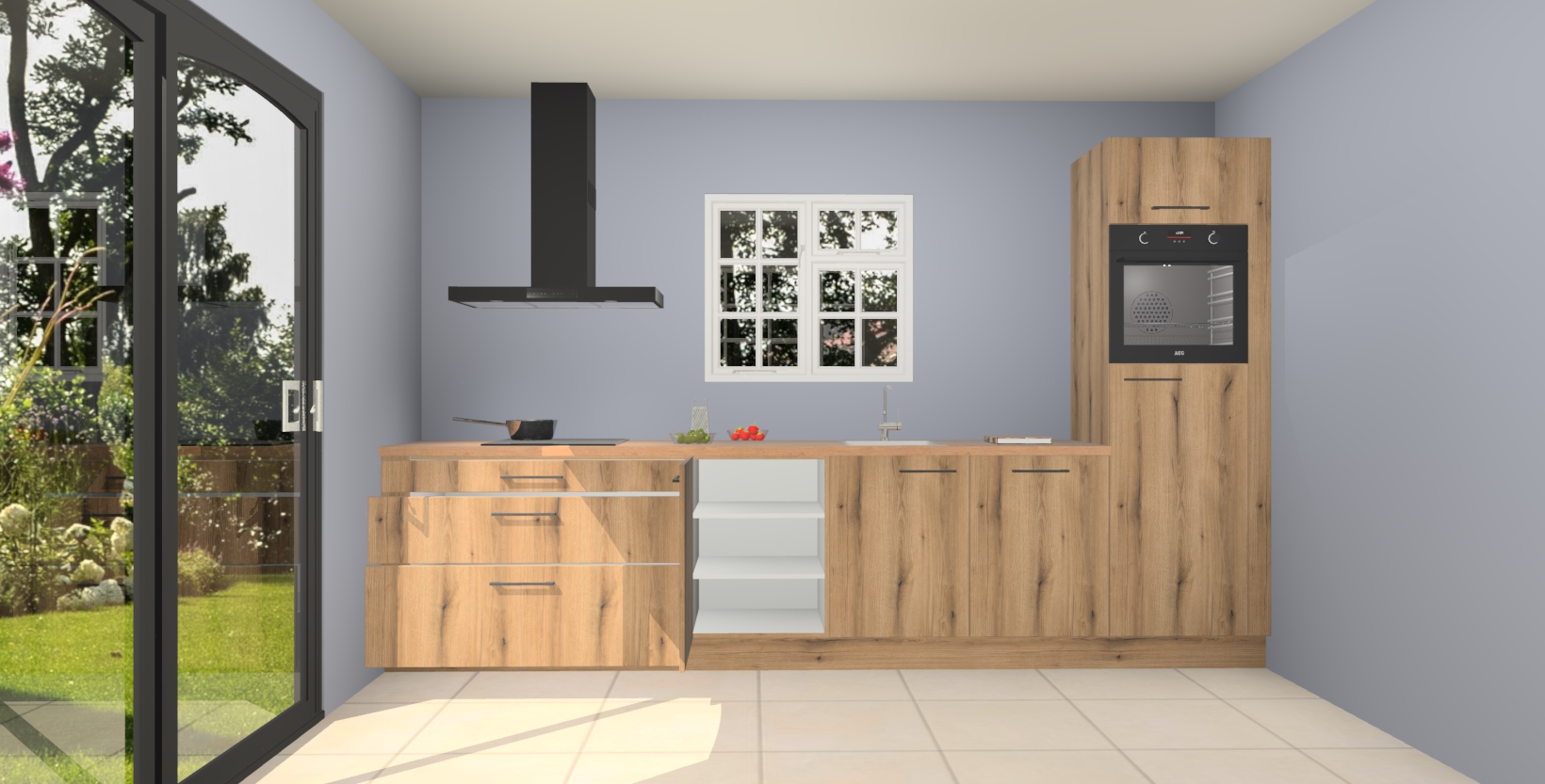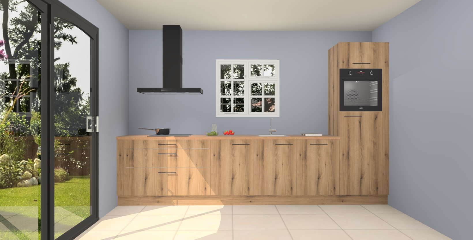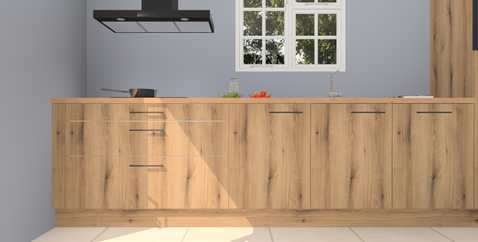 Maak kennis met de gouden eiken keuken Sofia: de perfecte mix van stijl en gemak. De keuken heeft vijf inbouw apparaten, plus een werkblad in houtlook dat meteen warmte en verfijning toevoegt.