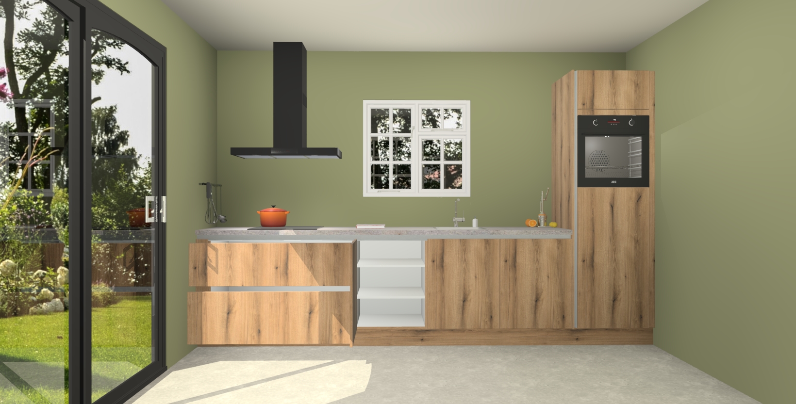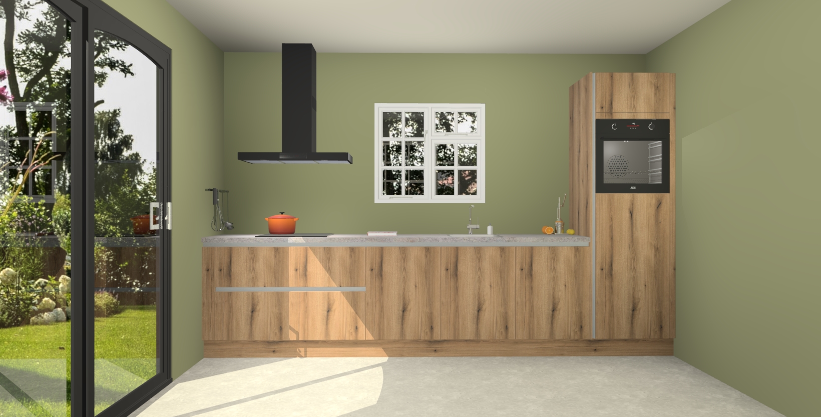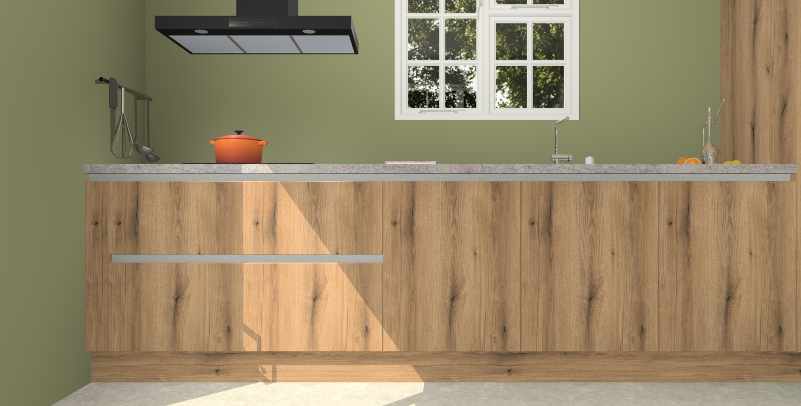 Maak kennis met de gouden eiken keuken Sofia: de perfecte mix van stijl en gemak. De keuken heeft vijf inbouw apparaten, plus een werkblad in houtlook dat meteen warmte en verfijning toevoegt.