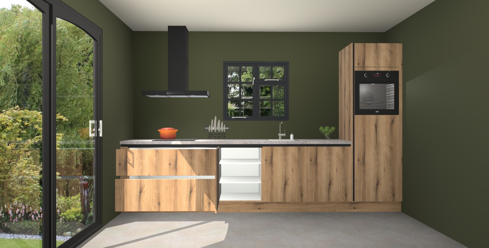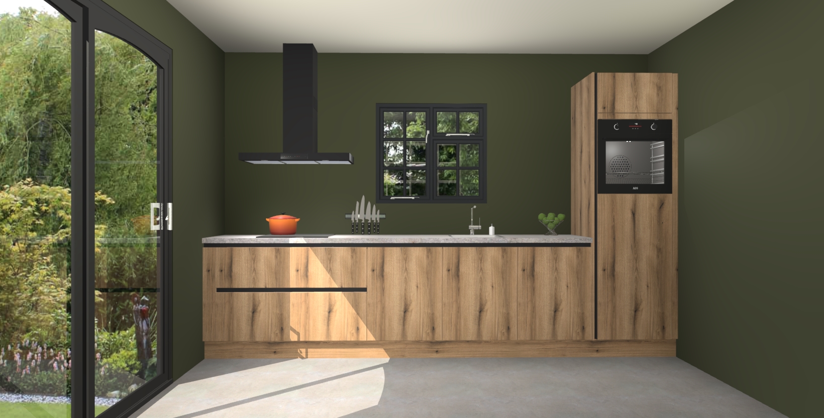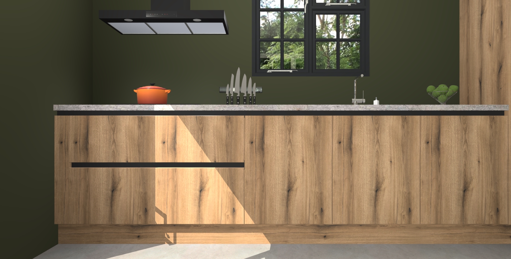 Maak kennis met de gouden eiken keuken Sofia: de perfecte mix van stijl en gemak. De keuken heeft vijf inbouw apparaten, plus een werkblad in houtlook dat meteen warmte en verfijning toevoegt.