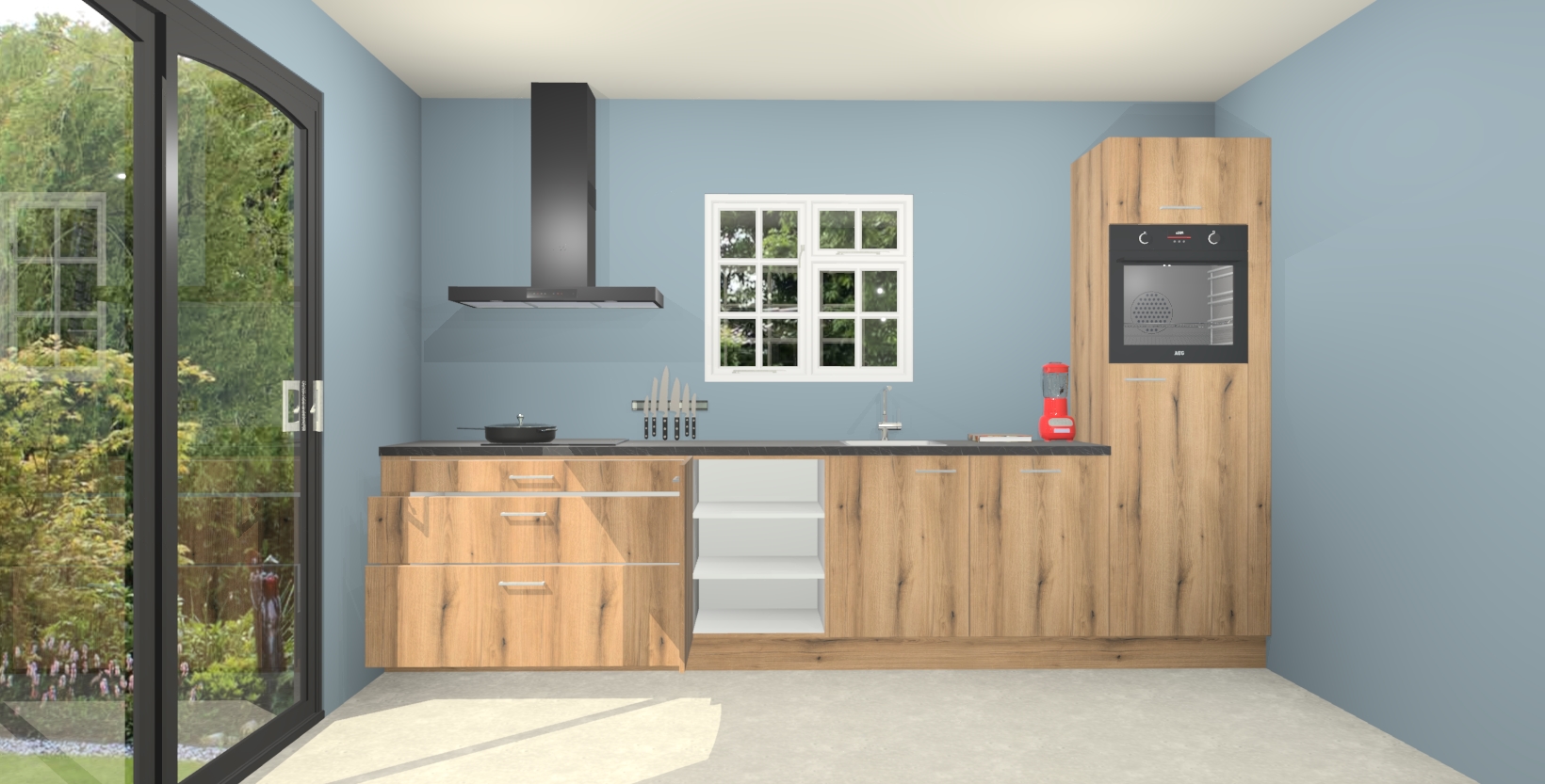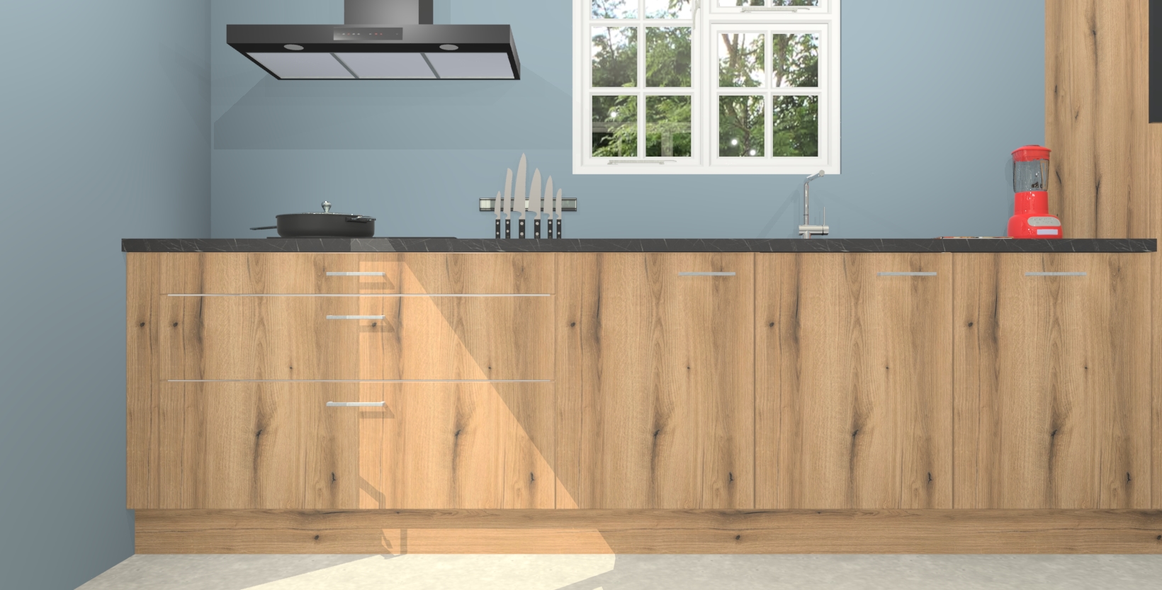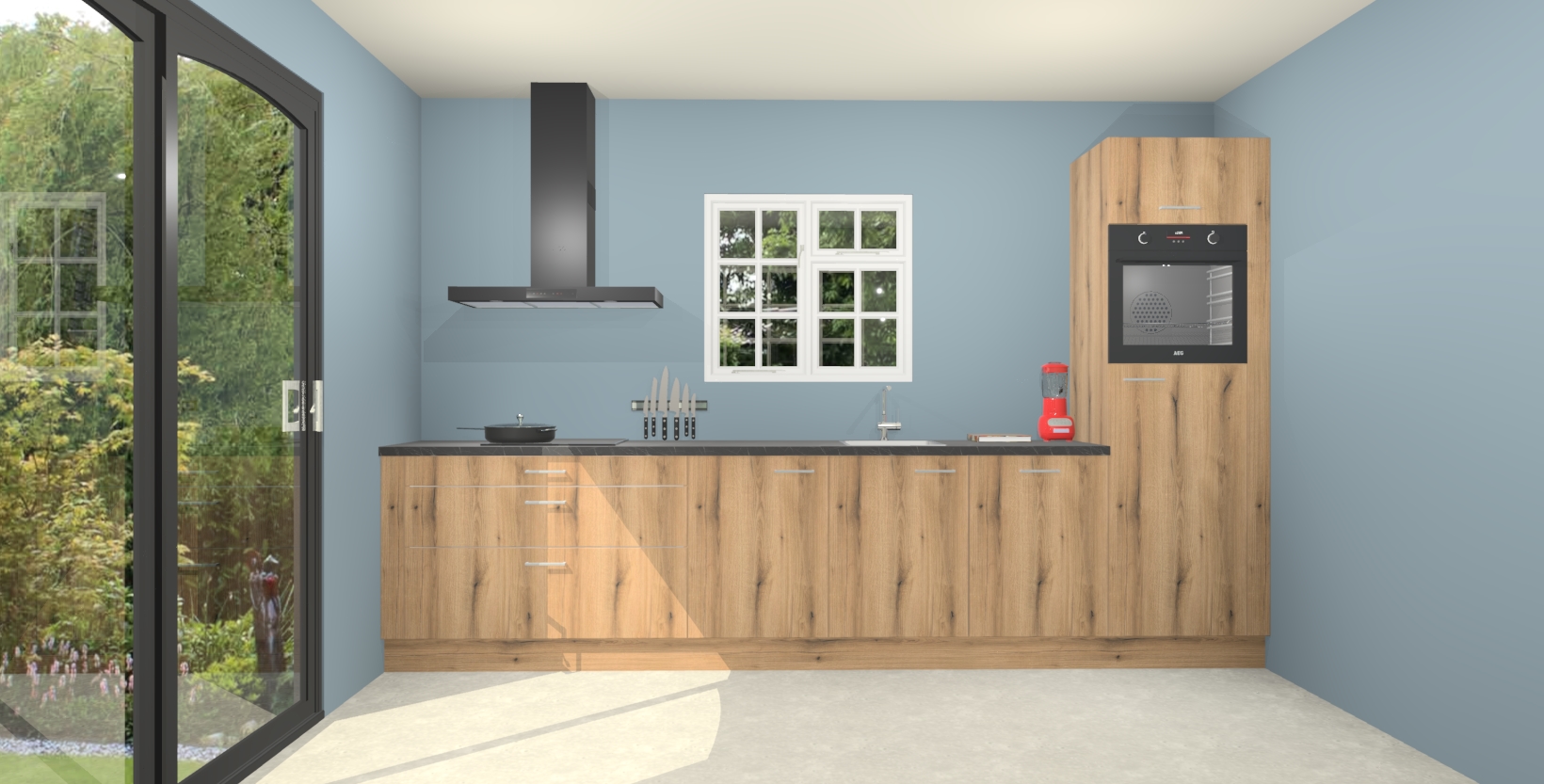 Maak kennis met de gouden eiken keuken Sofia: de perfecte mix van stijl en gemak. De keuken heeft vijf inbouw apparaten, plus een werkblad in houtlook dat meteen warmte en verfijning toevoegt.