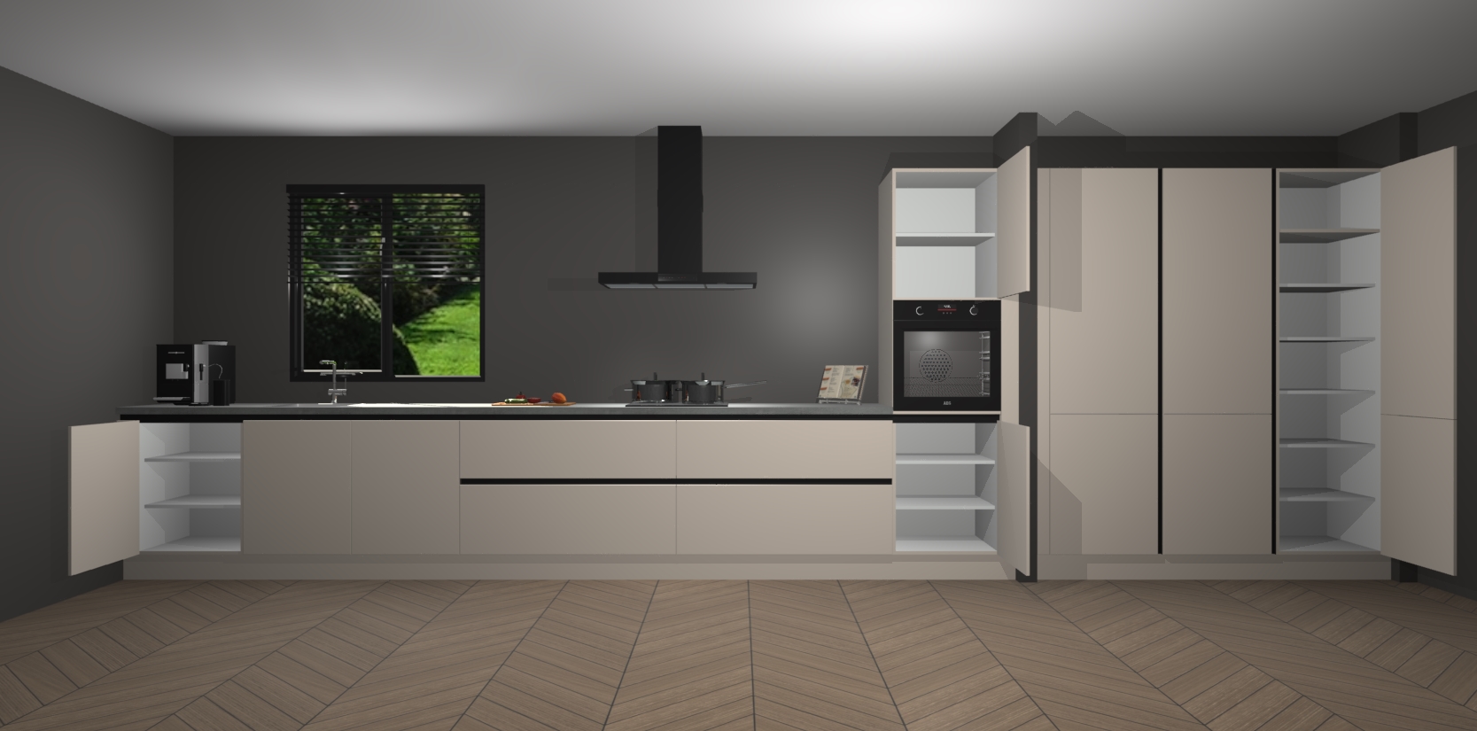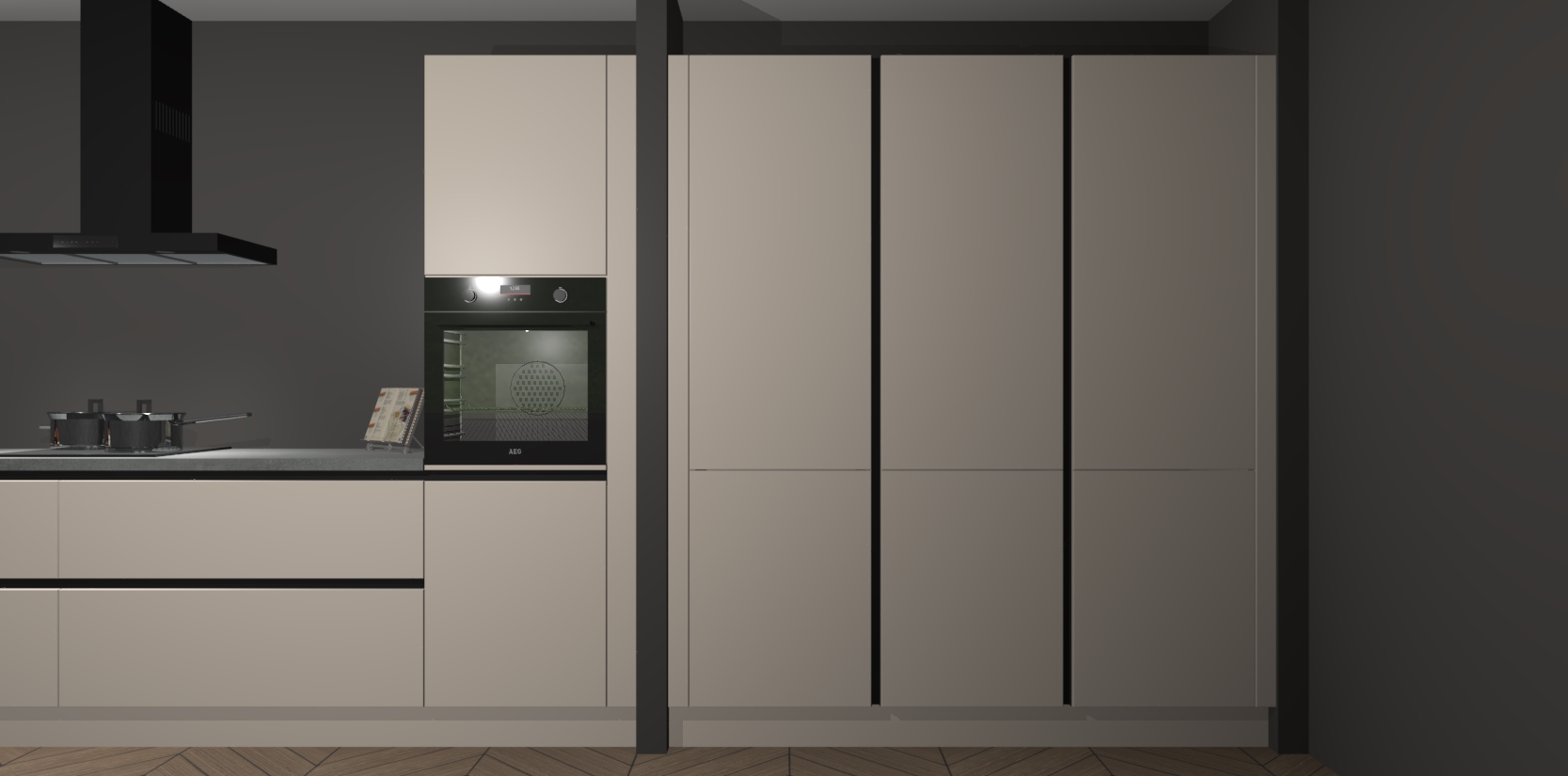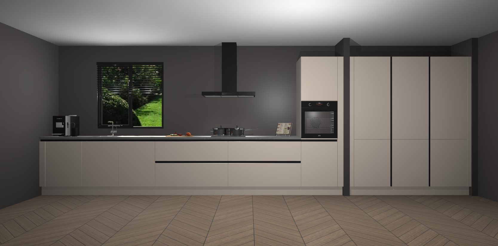 Een stijlvolle en praktische keuken als deze mag gezien worden. Dankzij de prachtige matte afwerking wordt de keuken gemakkelijk het middelpunt van uw huis - hij ziet er geweldig uit onder allerlei lichtomstandigheden, van dag tot nacht!