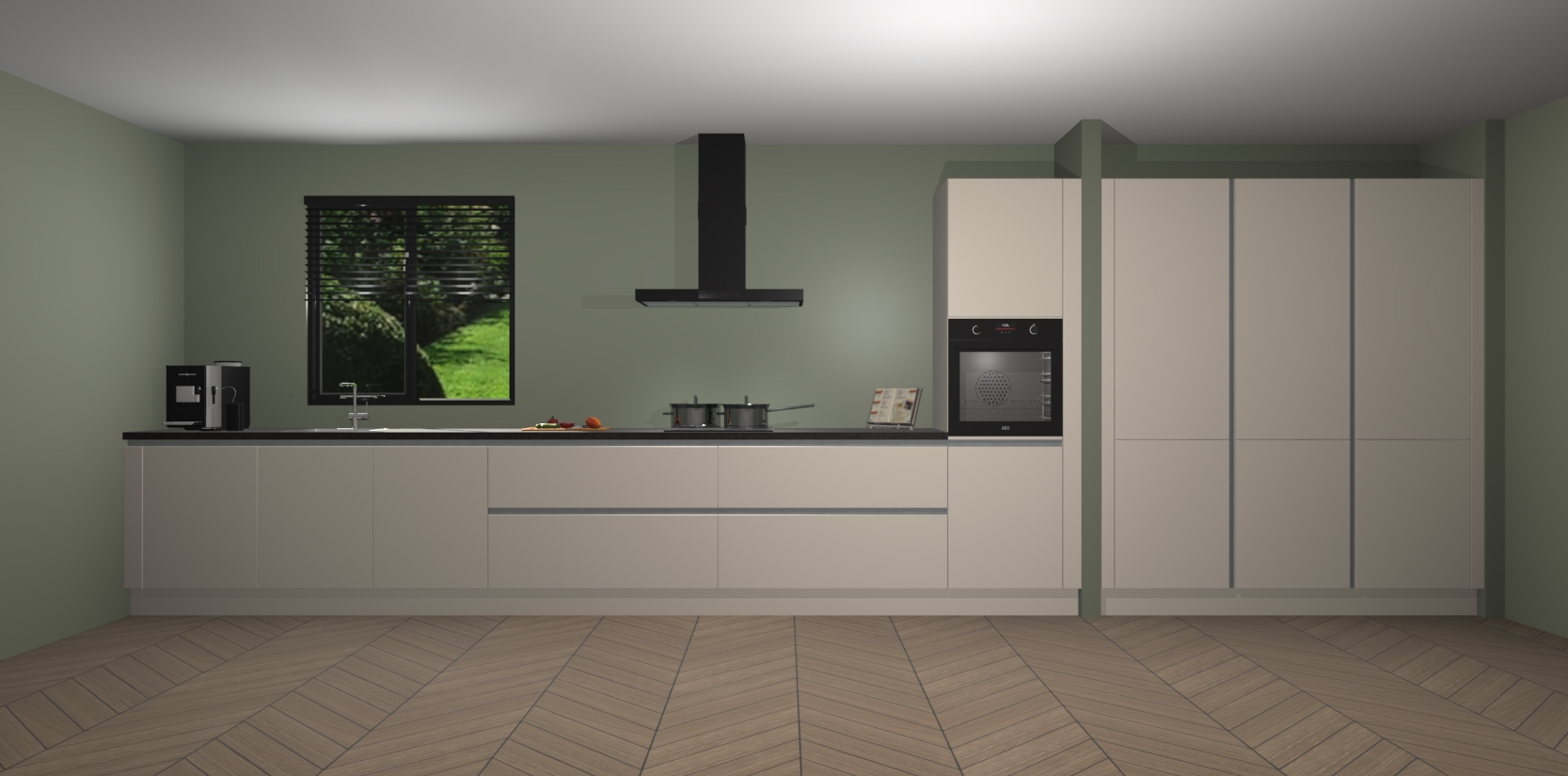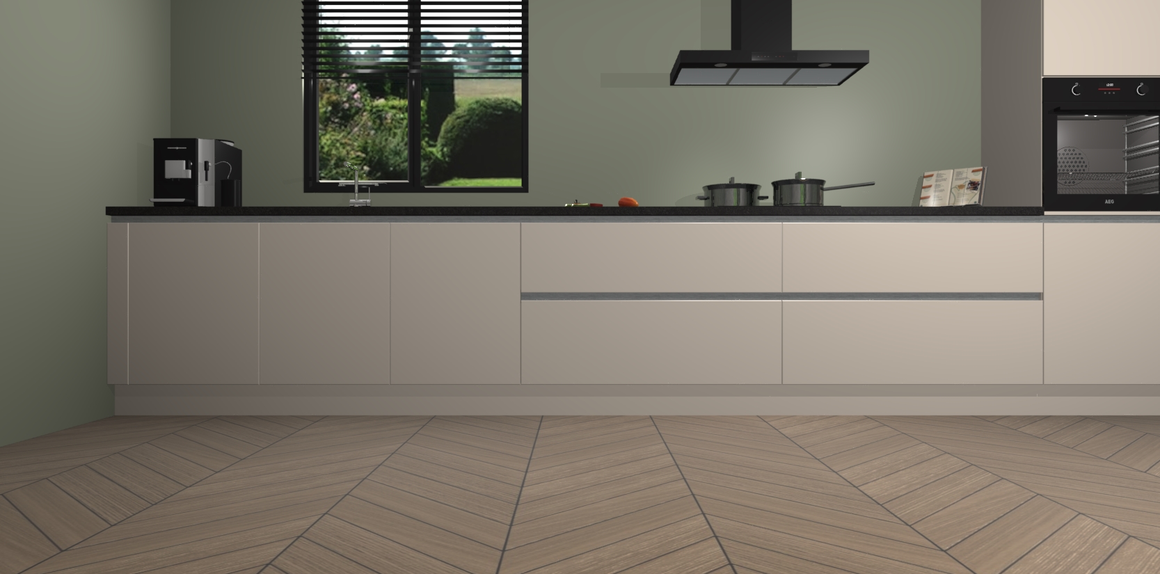 Een stijlvolle en praktische keuken als deze mag gezien worden. Dankzij de prachtige matte afwerking wordt de keuken gemakkelijk het middelpunt van uw huis - hij ziet er geweldig uit onder allerlei lichtomstandigheden, van dag tot nacht!