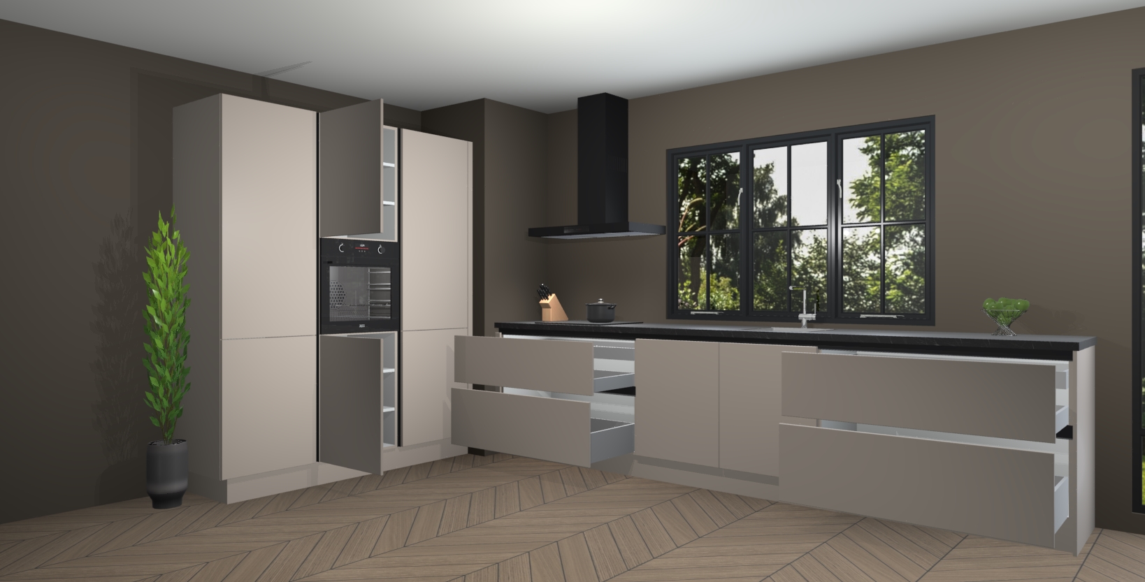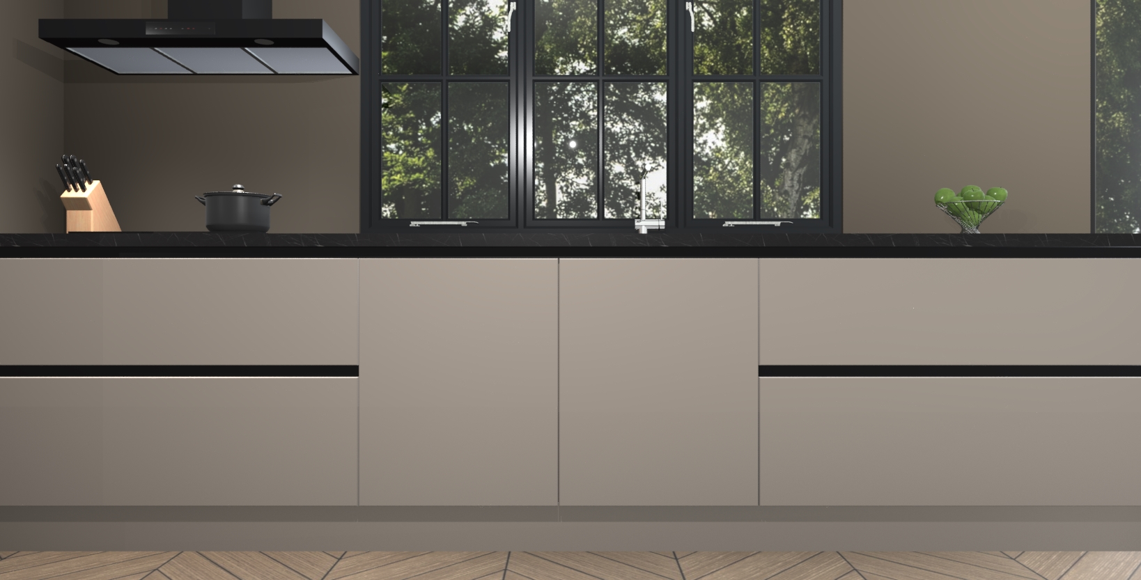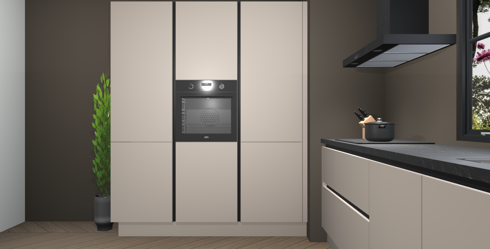 De softclose deuren openen en sluiten is ook heel eenvoudig - geniet van een moeiteloze keukenervaring, zelfs als er kinderen rondlopen. Voor extra gemak bij het plaatsen van uw bestelling bieden we ook een upgrade naar een kookplaat met geïntegreerde afzuiging.