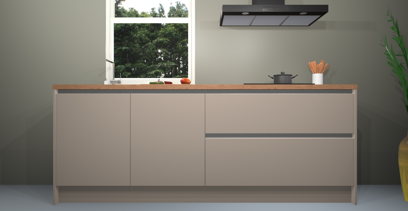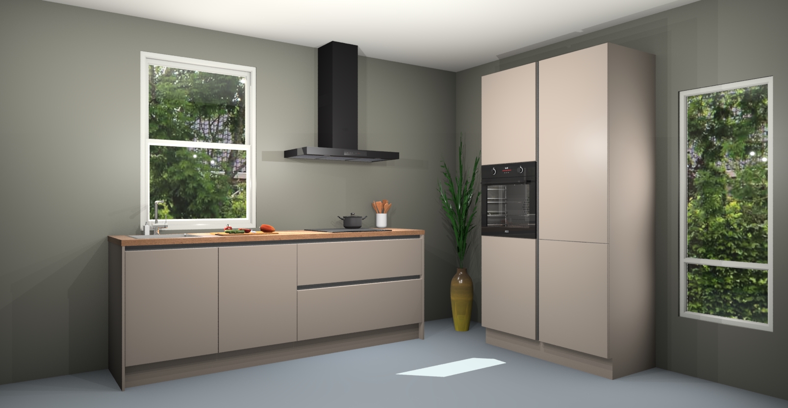 De kasjmier greeploze keuken Monaco heeft voldoende opbergruimte om uw keukenbenodigdheden georganiseerd en netjes te houden. Geniet van het gemak van de soft-close deuren, die deze stijlvolle look perfect afmaken. Maar dat is nog niet alles. Met de kasjmier greeploze keuken Monaco krijgt u maar liefst 5 ingebouwde apparaten: een oven, inductiekookplaat, afzuigkap, vaatwasser en koelkast. Deze kunnen gemakkelijk worden geüpgraded naar AEG als ze besteld zijn.