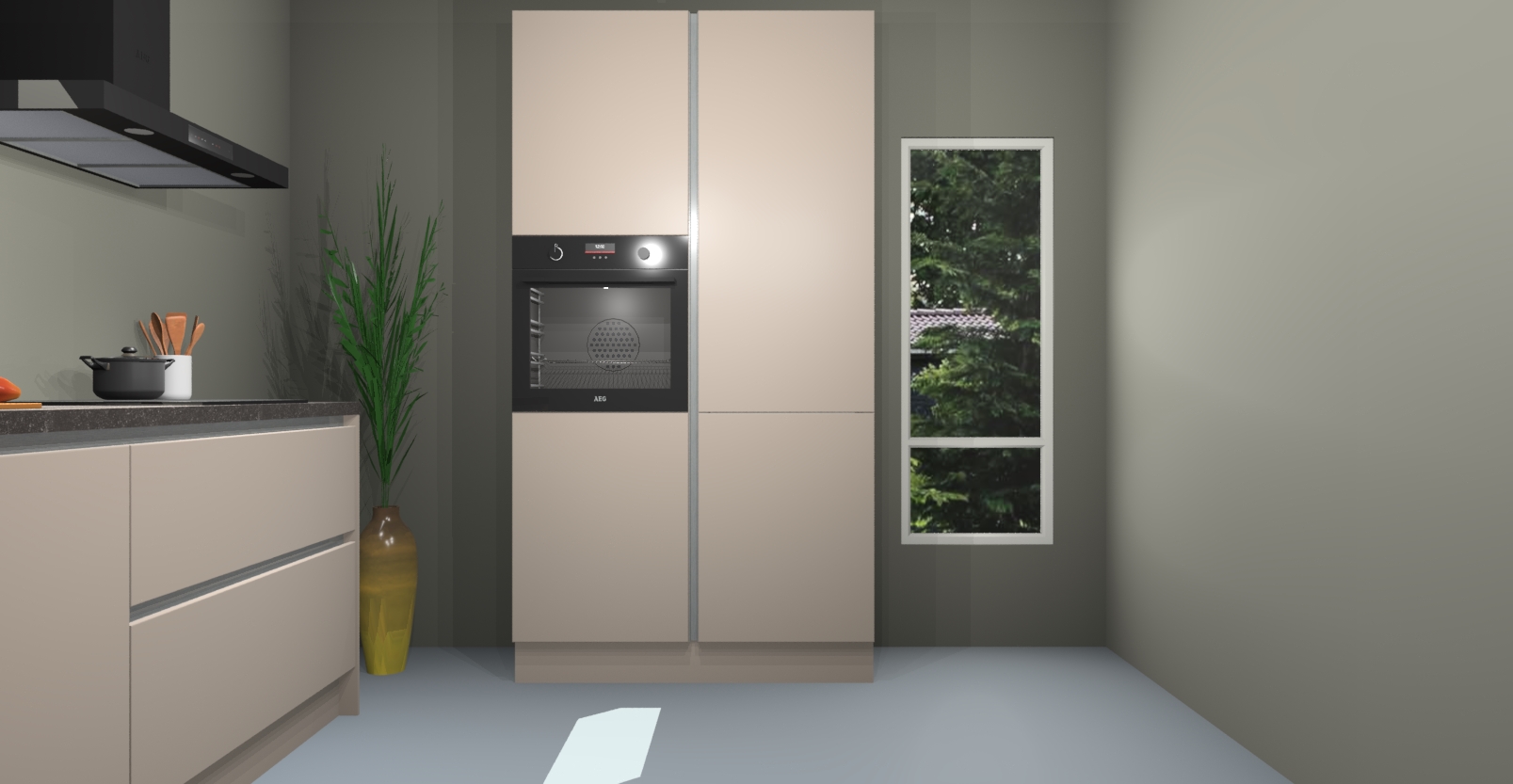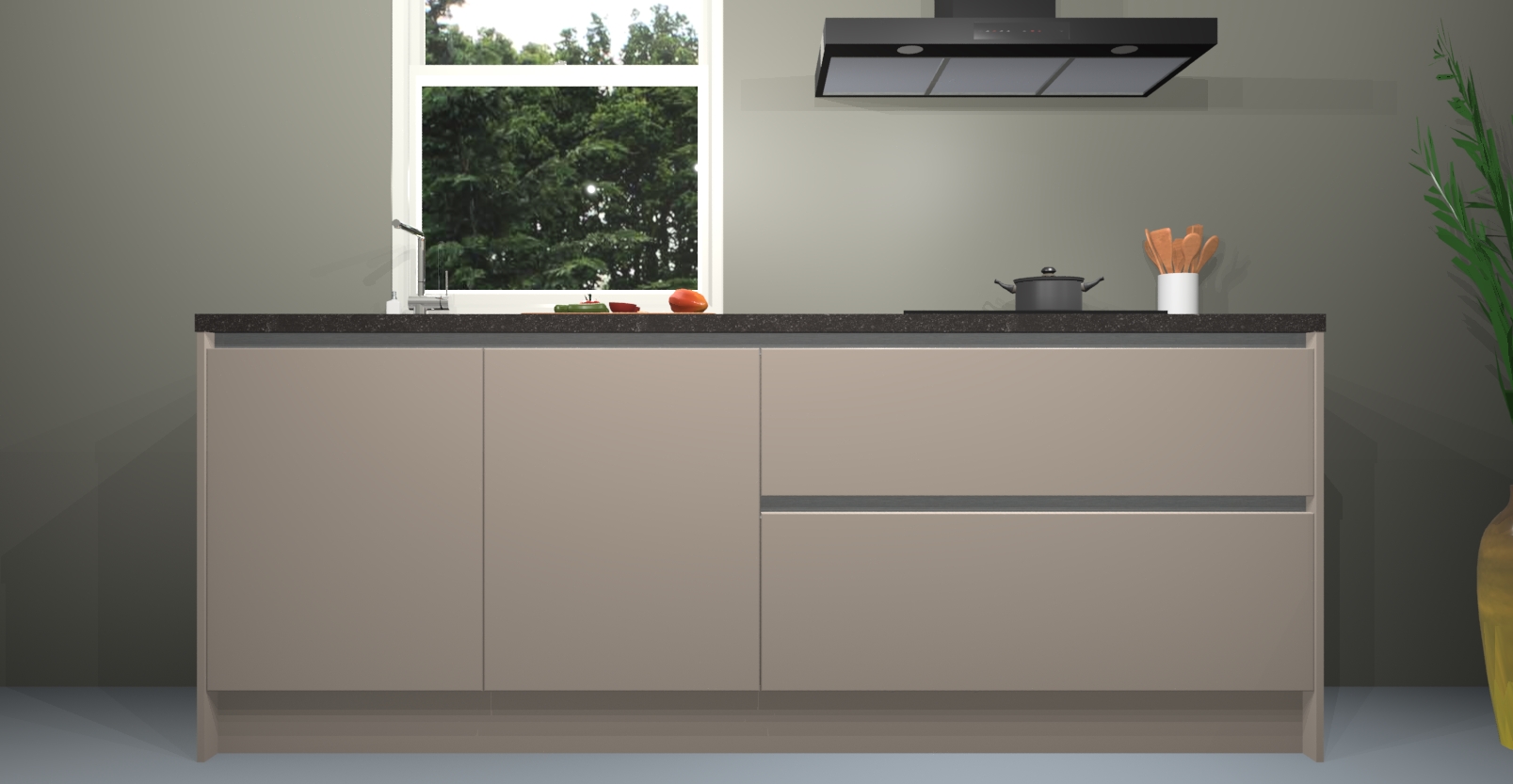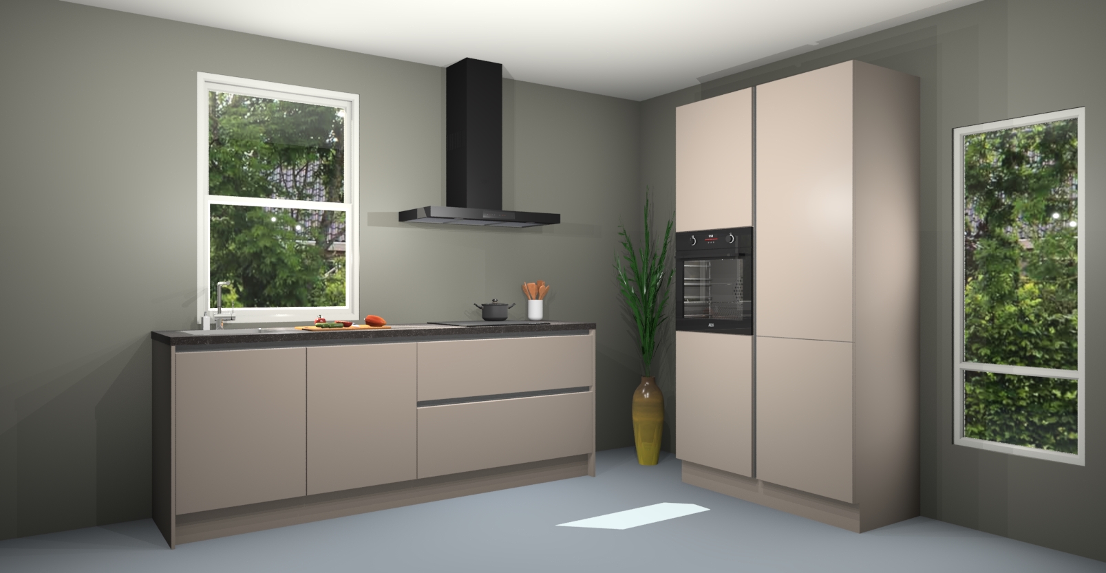 De kasjmier greeploze keuken Monaco heeft voldoende opbergruimte om uw keukenbenodigdheden georganiseerd en netjes te houden. Geniet van het gemak van de soft-close deuren, die deze stijlvolle look perfect afmaken. Maar dat is nog niet alles. Met de kasjmier greeploze keuken Monaco krijgt u maar liefst 5 ingebouwde apparaten: een oven, inductiekookplaat, afzuigkap, vaatwasser en koelkast. Deze kunnen gemakkelijk worden geüpgraded naar AEG als ze besteld zijn.