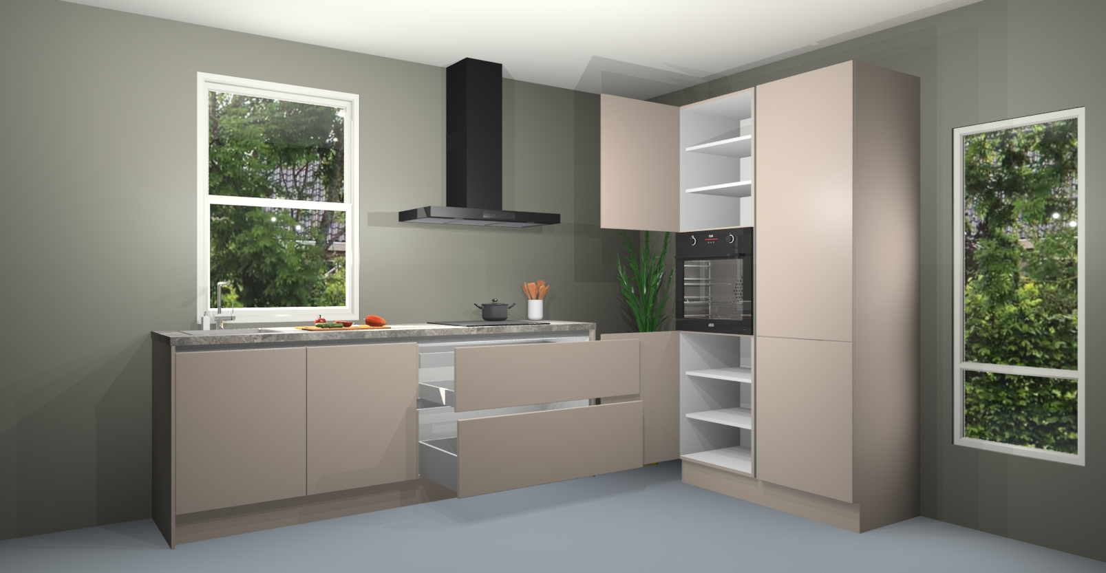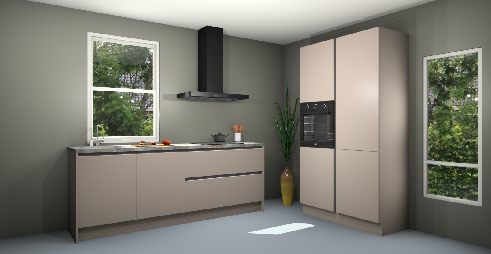 De kasjmier greeploze keuken Monaco heeft voldoende opbergruimte om uw keukenbenodigdheden georganiseerd en netjes te houden. Geniet van het gemak van de soft-close deuren, die deze stijlvolle look perfect afmaken. Maar dat is nog niet alles. Met de kasjmier greeploze keuken Monaco krijgt u maar liefst 5 ingebouwde apparaten: een oven, inductiekookplaat, afzuigkap, vaatwasser en koelkast. Deze kunnen gemakkelijk worden geüpgraded naar AEG als ze besteld zijn.