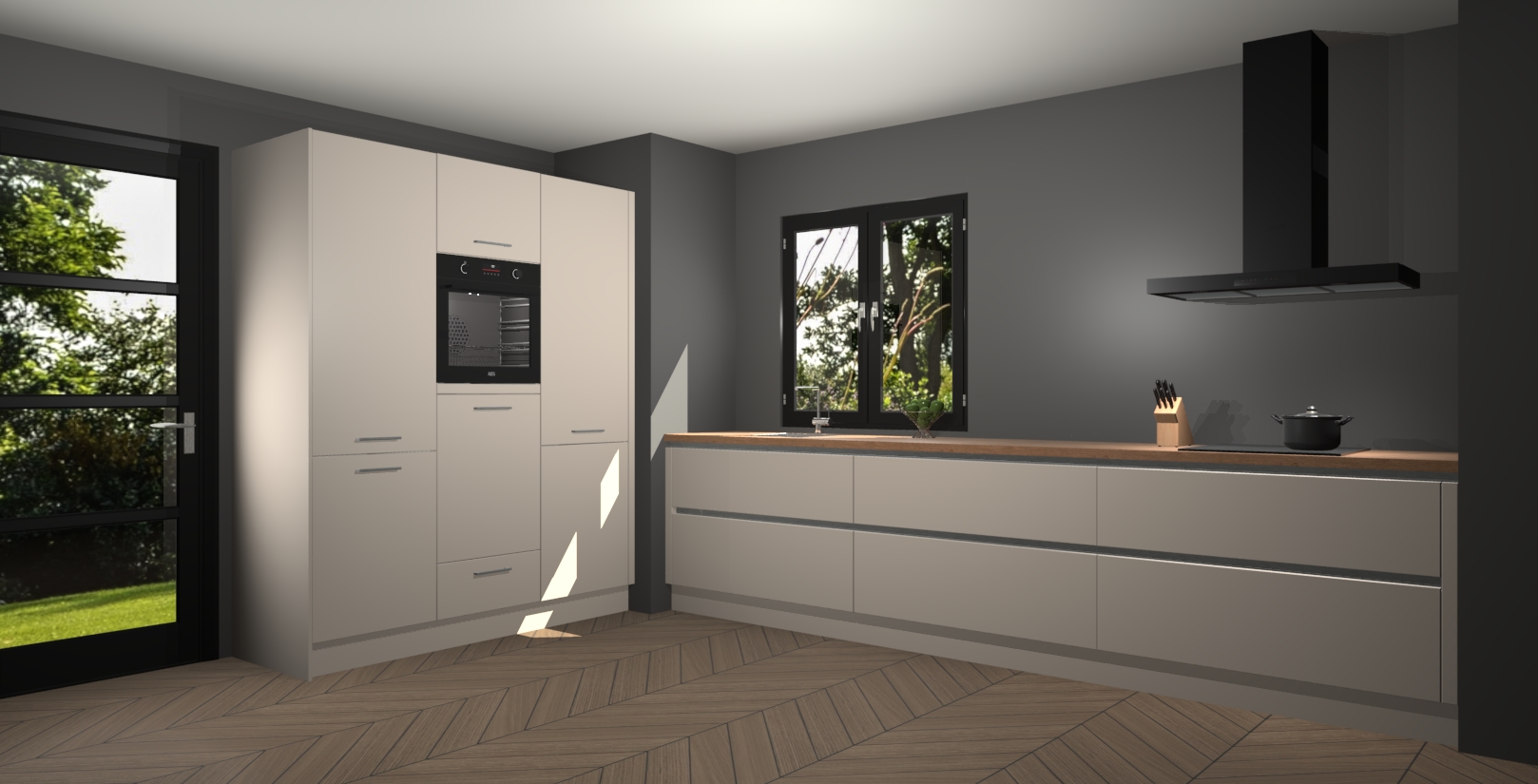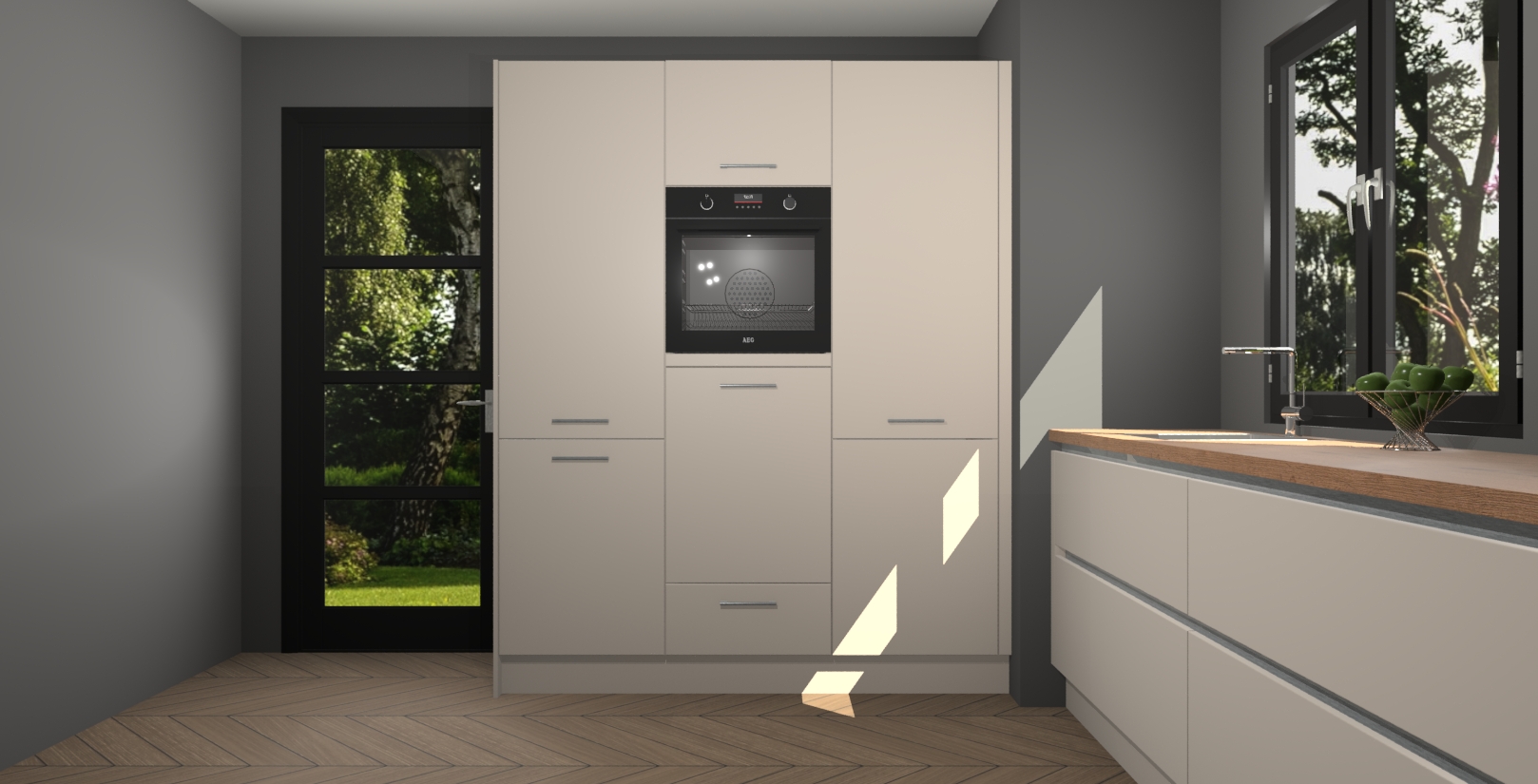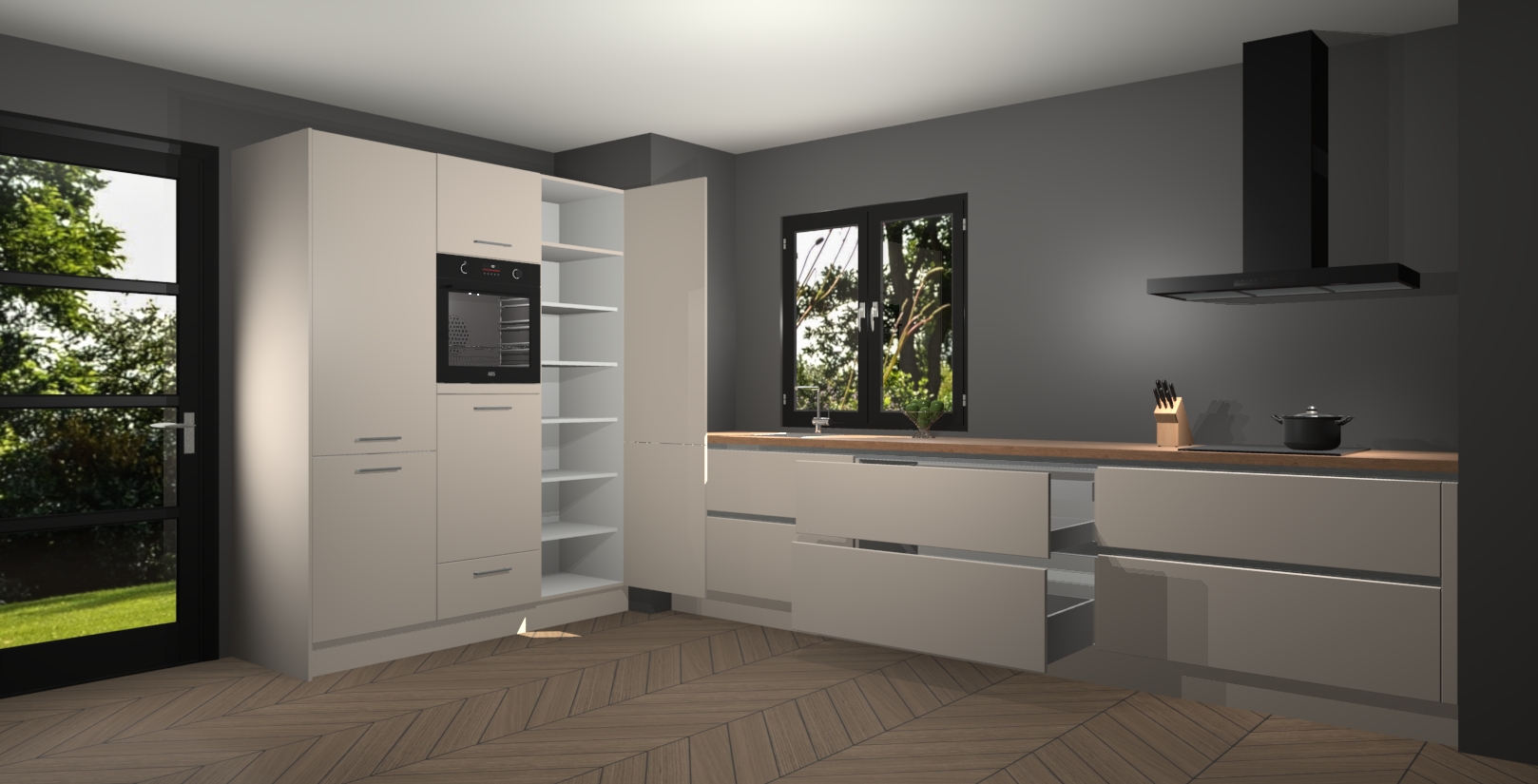 De softclose deuren openen en sluiten is ook heel eenvoudig - geniet van een moeiteloze keukenervaring, zelfs als er kinderen rondlopen. Voor extra gemak bij het plaatsen van uw bestelling bieden we ook een upgrade naar een kookplaat met geïntegreerde afzuiging.