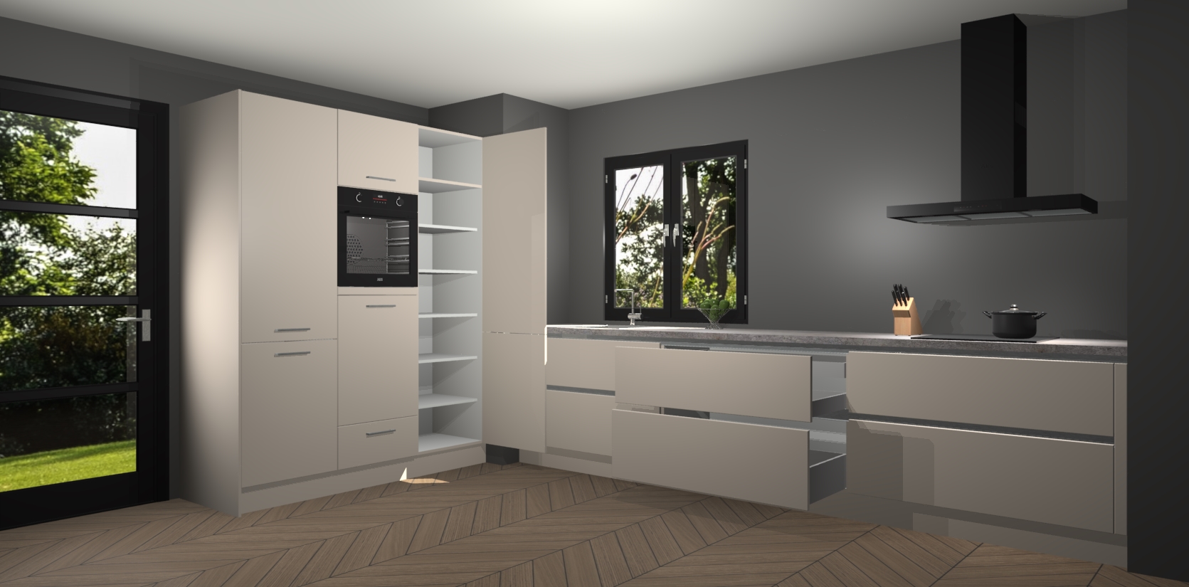De softclose deuren openen en sluiten is ook heel eenvoudig - geniet van een moeiteloze keukenervaring, zelfs als er kinderen rondlopen. Voor extra gemak bij het plaatsen van uw bestelling bieden we ook een upgrade naar een kookplaat met geïntegreerde afzuiging.