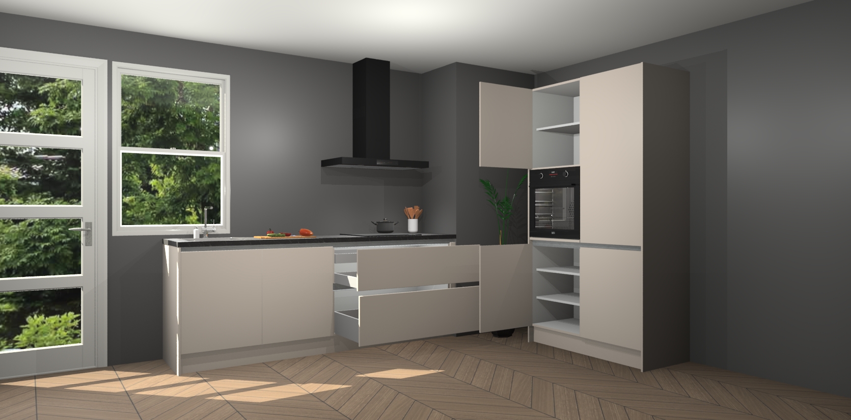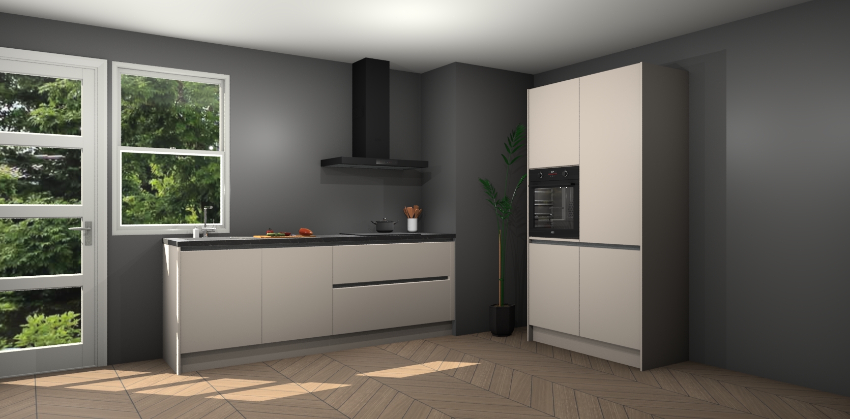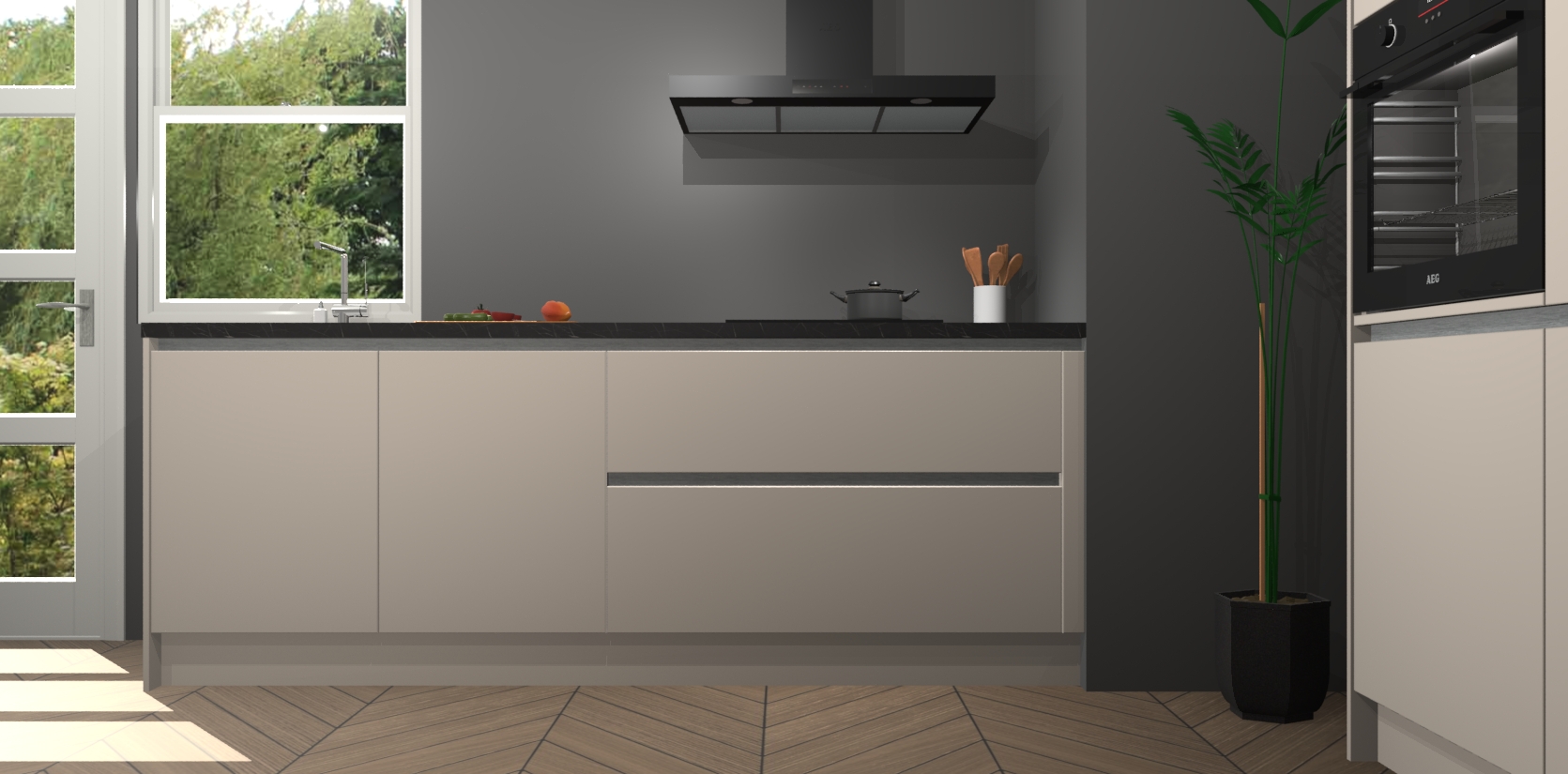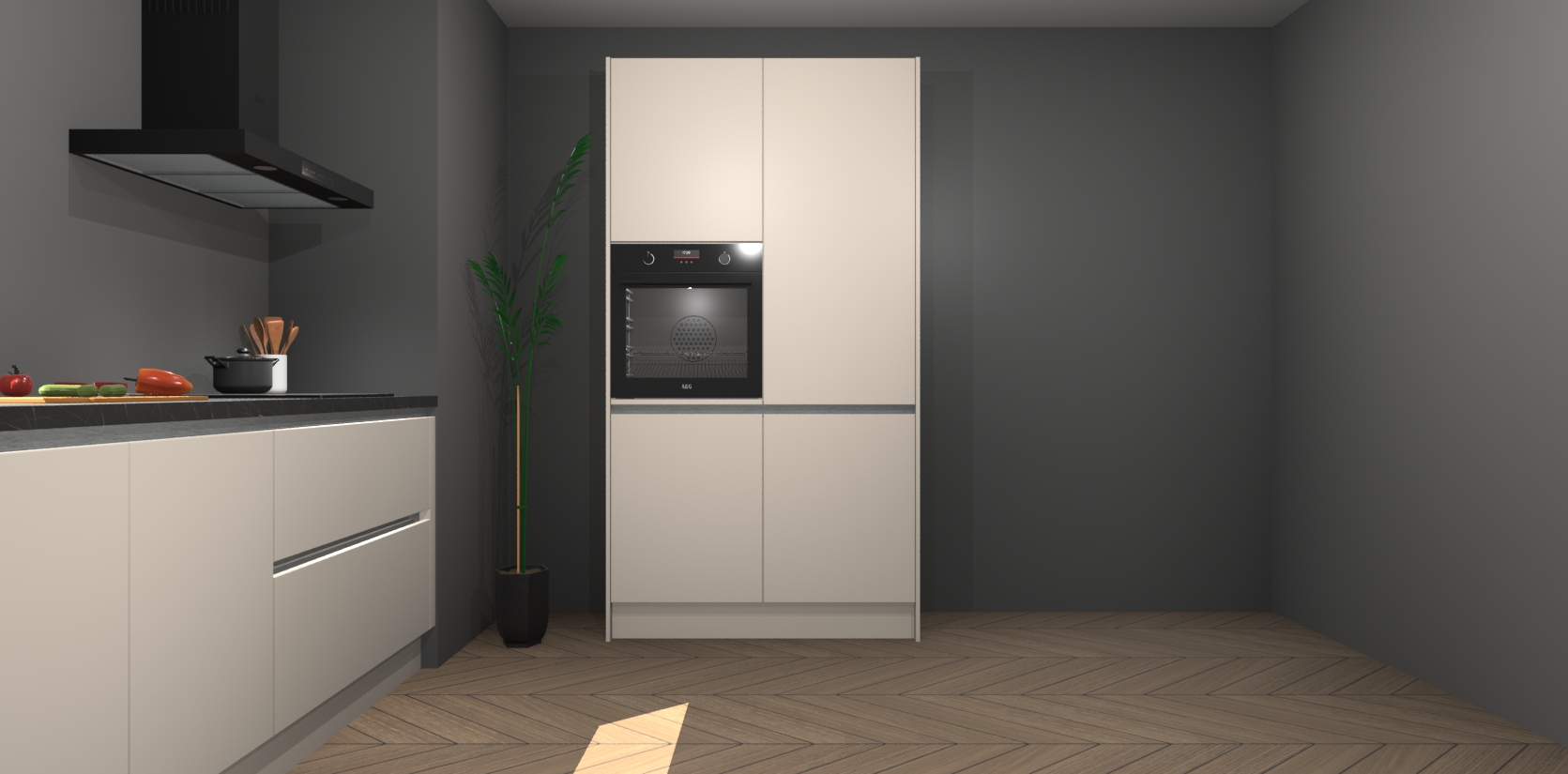 De kasjmier greeploze keuken Uganda heeft voldoende opbergruimte om uw keukenbenodigdheden georganiseerd en netjes te houden. Geniet van het gemak van de soft-close deuren, die deze stijlvolle look perfect afmaken. Maar dat is nog niet alles. Met de kasjmier greeploze keuken Uganda krijgt u maar liefst 5 ingebouwde apparaten: een oven, inductiekookplaat, afzuigkap, vaatwasser en koelkast. Deze kunnen gemakkelijk worden geüpgraded naar AEG als ze besteld zijn.