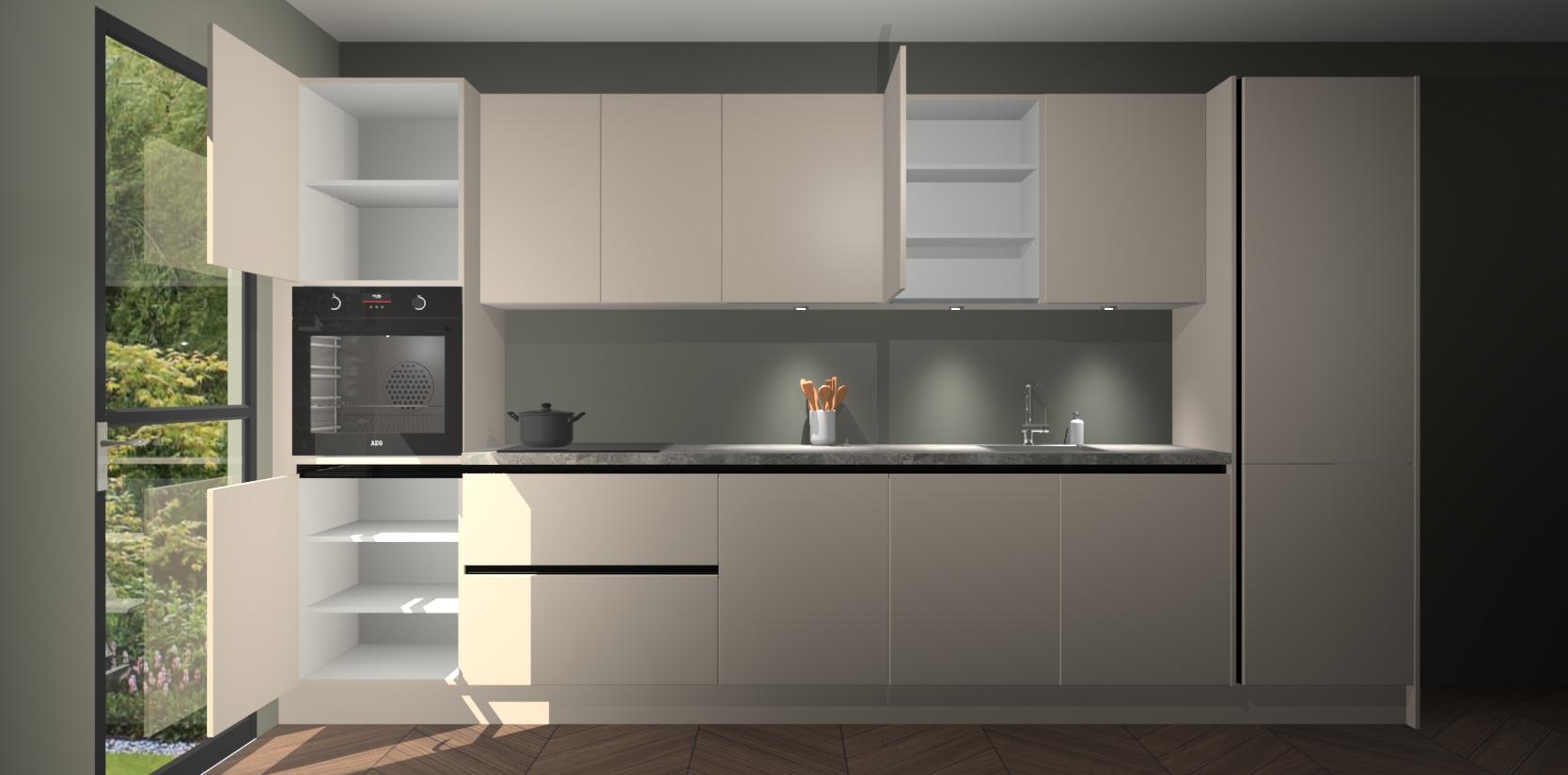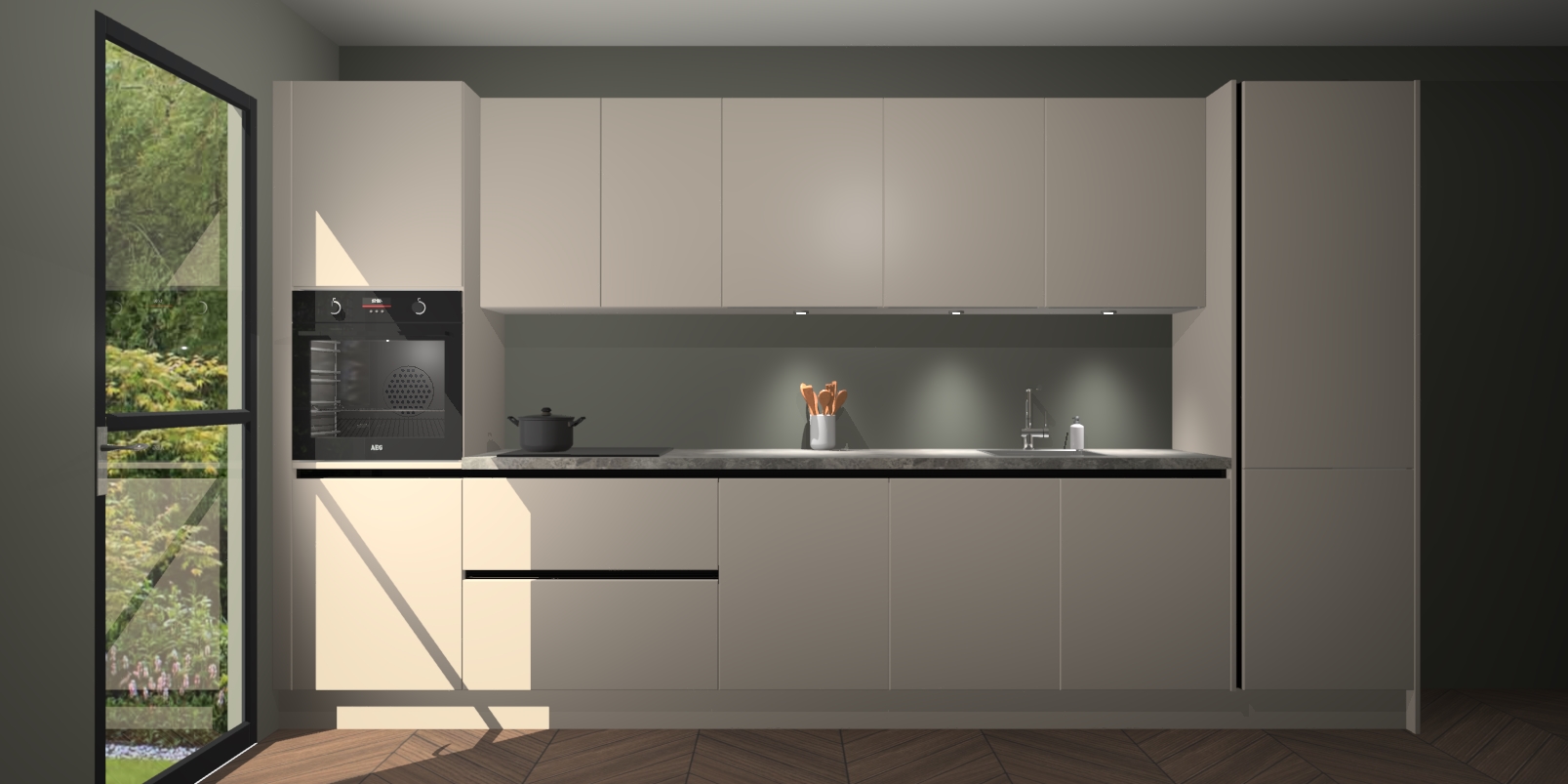 Dit is de perfecte keuken voor wie op zoek is naar een luxueuze stijl zonder zijn portemonnee te legen! Het chique ontwerp van de kasjmier greeploze keuken Wels voegt dat vleugje verfijning toe aan elk huis. Het gemak van voorgemonteerde kasten bespaart u talloze uren tijd en energie, zodat u veel sneller dan verwacht kunt beginnen te genieten van uw prachtige nieuwe keuken. Bovendien bedraagt de levertijd slechts 7 weken.
