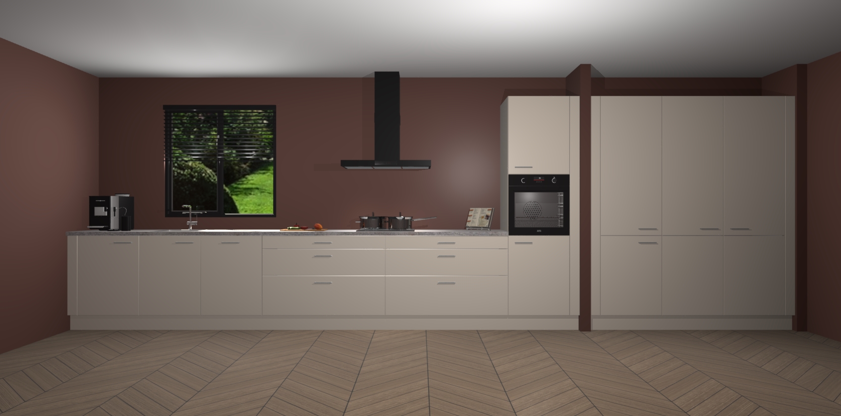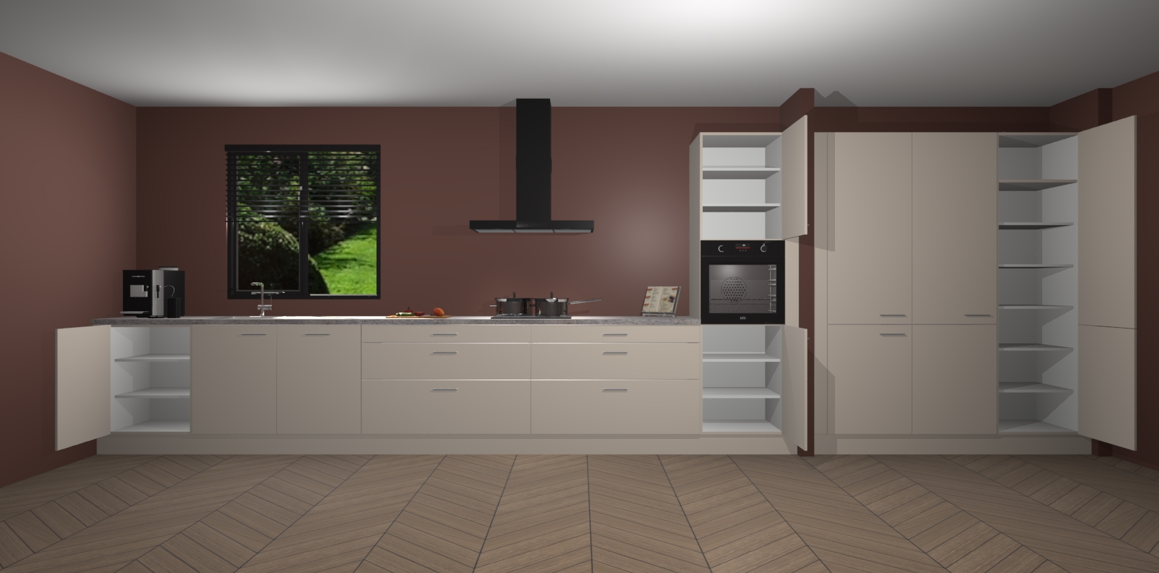 Een stijlvolle en praktische keuken als deze mag gezien worden. Dankzij de prachtige matte afwerking wordt de keuken gemakkelijk het middelpunt van uw huis - hij ziet er geweldig uit onder allerlei lichtomstandigheden, van dag tot nacht!