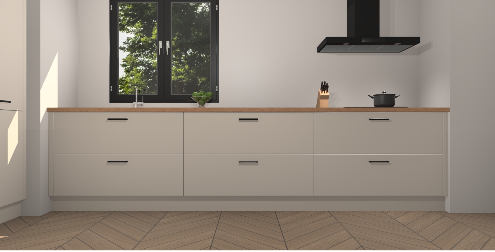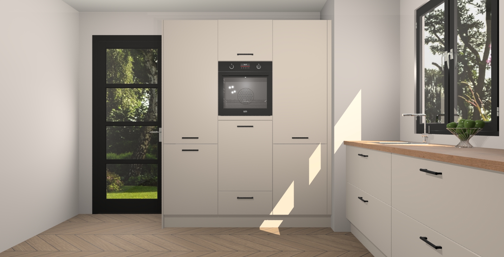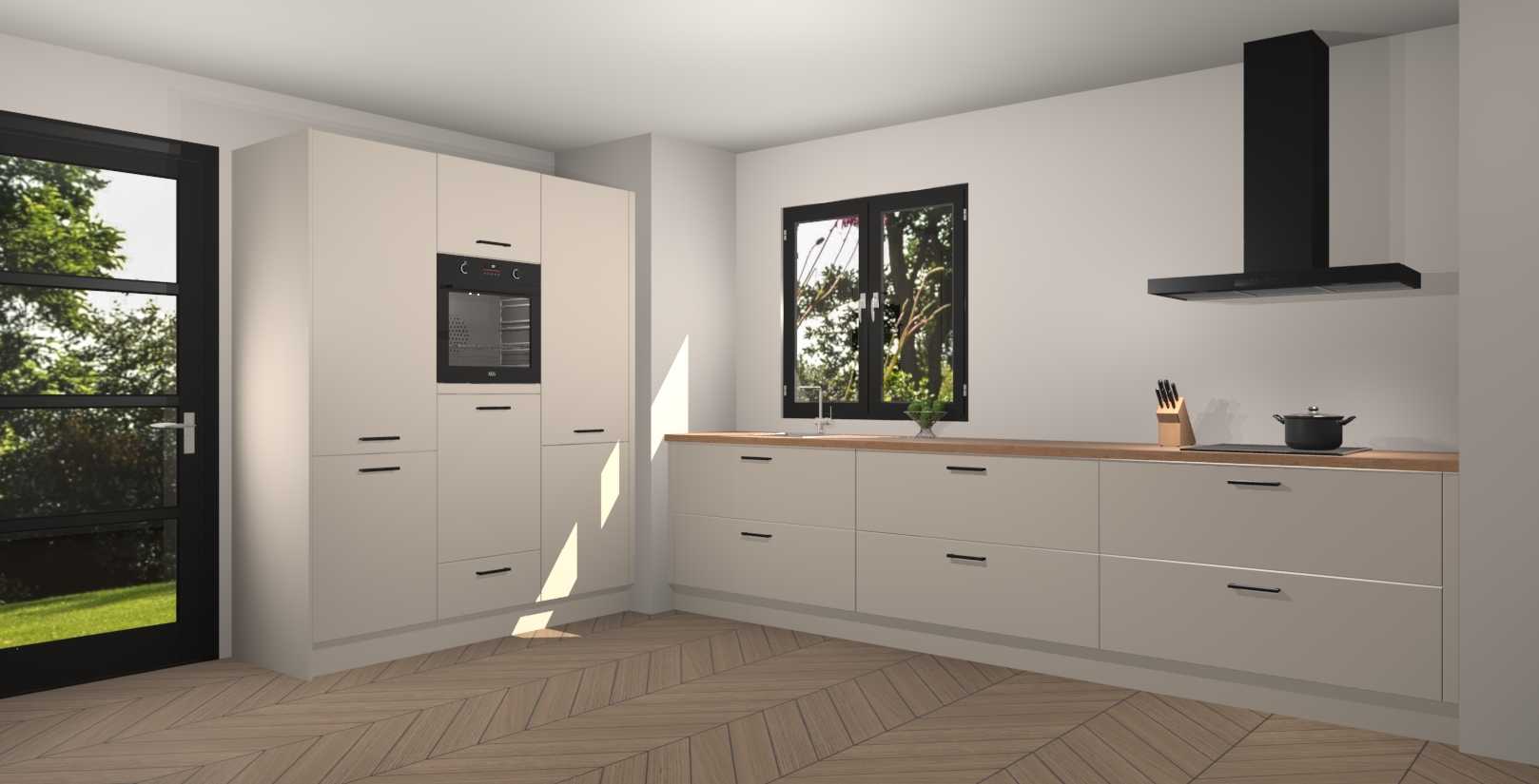 De softclose deuren openen en sluiten is ook heel eenvoudig - geniet van een moeiteloze keukenervaring, zelfs als er kinderen rondlopen. Voor extra gemak bij het plaatsen van uw bestelling bieden we ook een upgrade naar een kookplaat met geïntegreerde afzuiging.