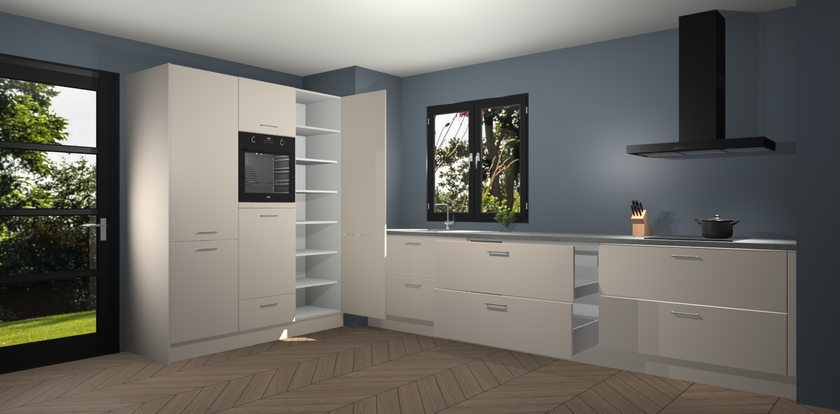 De softclose deuren openen en sluiten is ook heel eenvoudig - geniet van een moeiteloze keukenervaring, zelfs als er kinderen rondlopen. Voor extra gemak bij het plaatsen van uw bestelling bieden we ook een upgrade naar een kookplaat met geïntegreerde afzuiging.