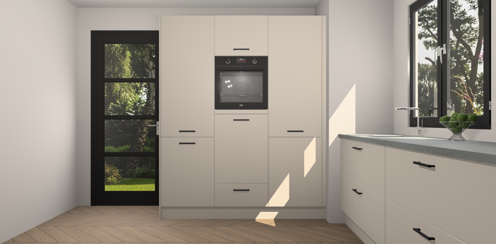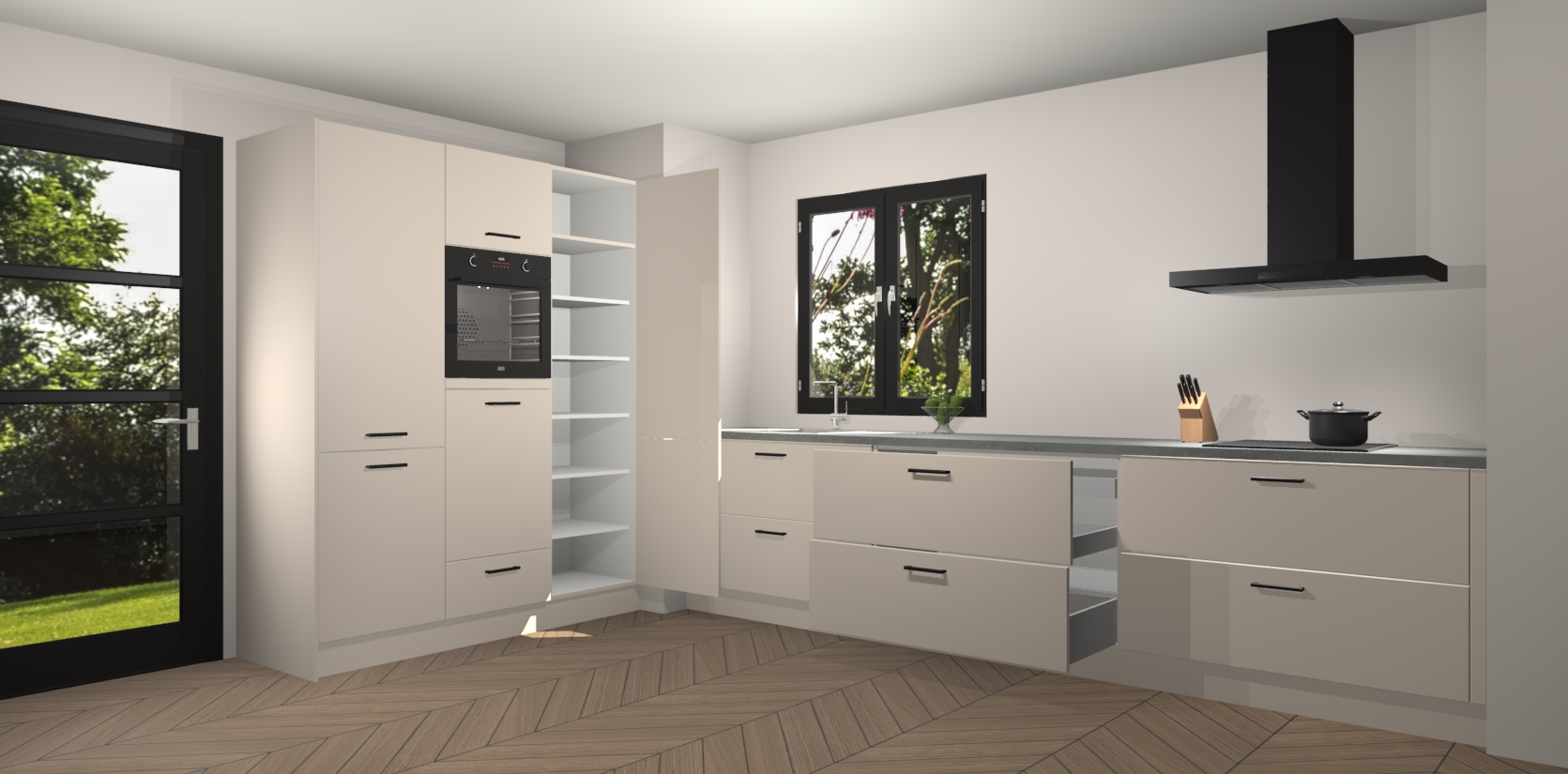 De softclose deuren openen en sluiten is ook heel eenvoudig - geniet van een moeiteloze keukenervaring, zelfs als er kinderen rondlopen. Voor extra gemak bij het plaatsen van uw bestelling bieden we ook een upgrade naar een kookplaat met geïntegreerde afzuiging.