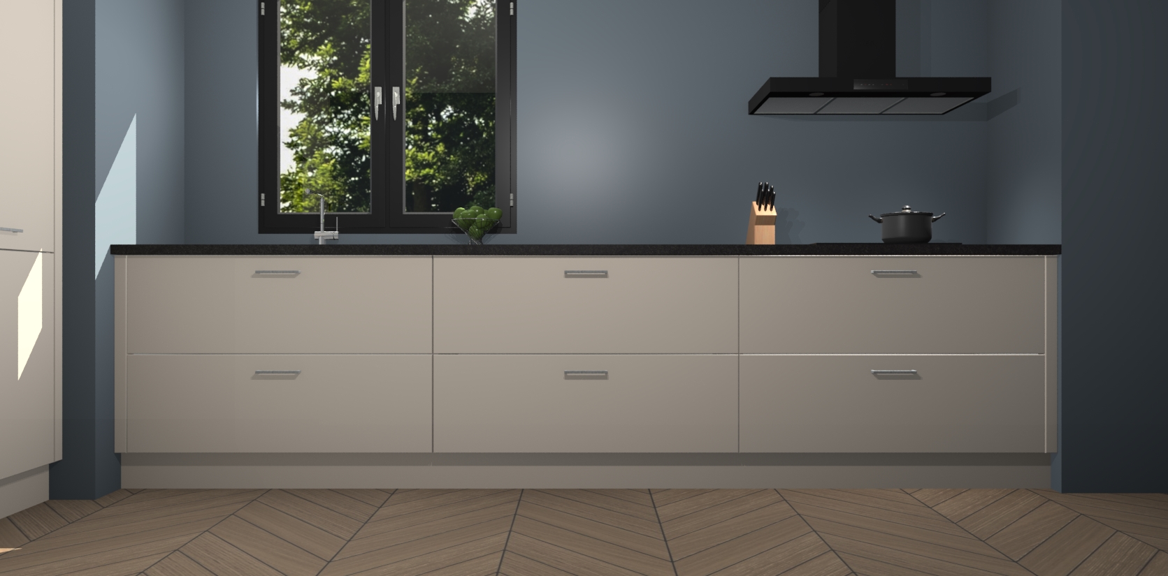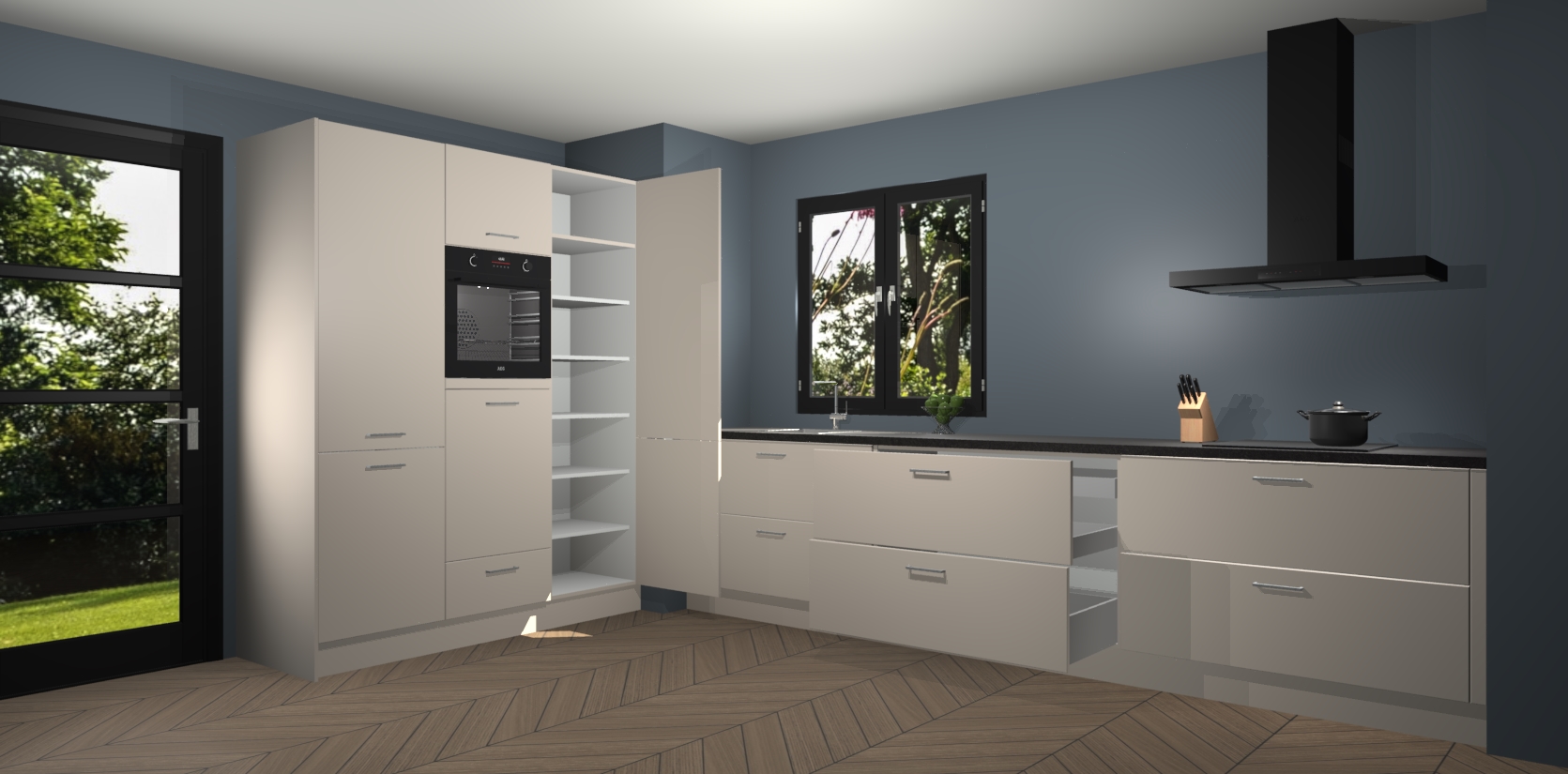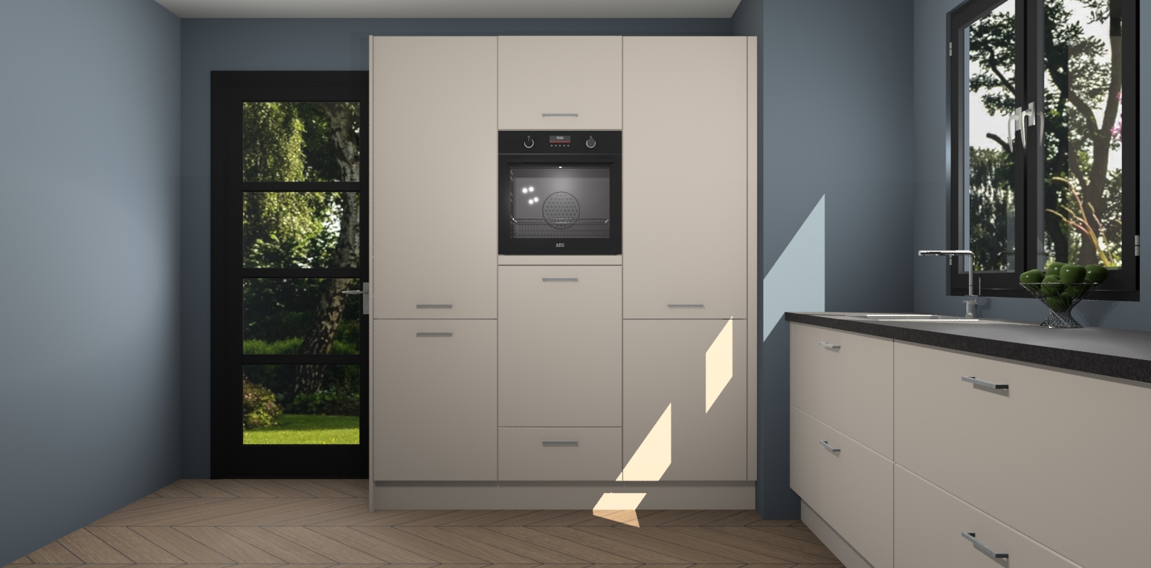 De softclose deuren openen en sluiten is ook heel eenvoudig - geniet van een moeiteloze keukenervaring, zelfs als er kinderen rondlopen. Voor extra gemak bij het plaatsen van uw bestelling bieden we ook een upgrade naar een kookplaat met geïntegreerde afzuiging.