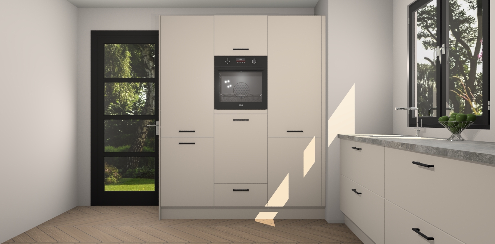 De softclose deuren openen en sluiten is ook heel eenvoudig - geniet van een moeiteloze keukenervaring, zelfs als er kinderen rondlopen. Voor extra gemak bij het plaatsen van uw bestelling bieden we ook een upgrade naar een kookplaat met geïntegreerde afzuiging.