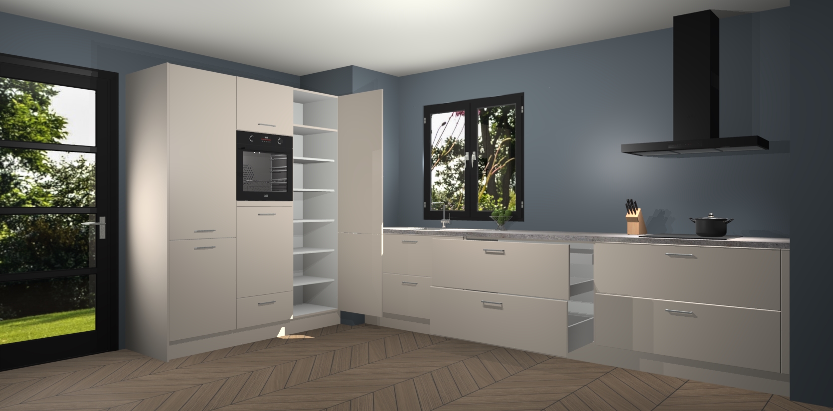 De softclose deuren openen en sluiten is ook heel eenvoudig - geniet van een moeiteloze keukenervaring, zelfs als er kinderen rondlopen. Voor extra gemak bij het plaatsen van uw bestelling bieden we ook een upgrade naar een kookplaat met geïntegreerde afzuiging.