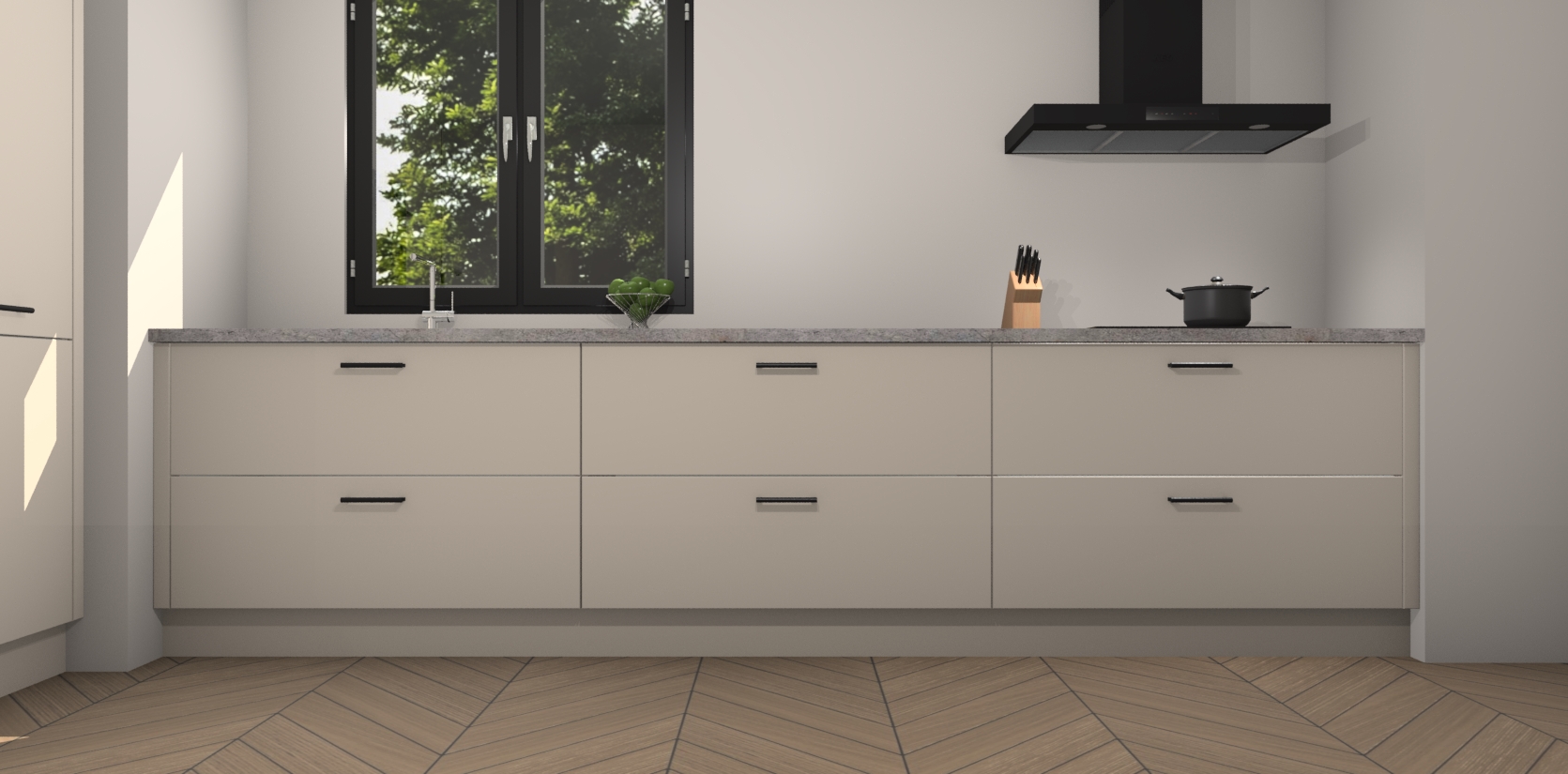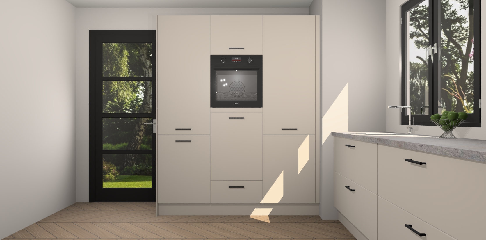 De softclose deuren openen en sluiten is ook heel eenvoudig - geniet van een moeiteloze keukenervaring, zelfs als er kinderen rondlopen. Voor extra gemak bij het plaatsen van uw bestelling bieden we ook een upgrade naar een kookplaat met geïntegreerde afzuiging.
