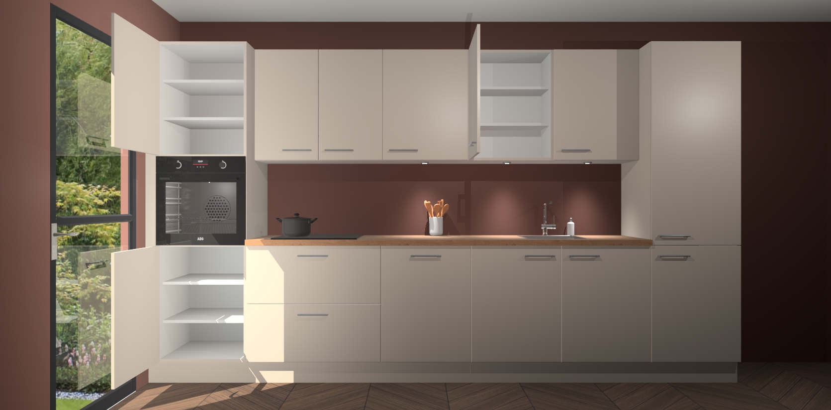Dit is de perfecte keuken voor wie op zoek is naar een luxueuze stijl zonder zijn portemonnee te legen! Het chique ontwerp van de kasjmier keuken Wels voegt dat vleugje verfijning toe aan elk huis. Het gemak van voorgemonteerde kasten bespaart u talloze uren tijd en energie, zodat u veel sneller dan verwacht kunt beginnen te genieten van uw prachtige nieuwe keuken. Bovendien bedraagt de levertijd slechts 7 weken.