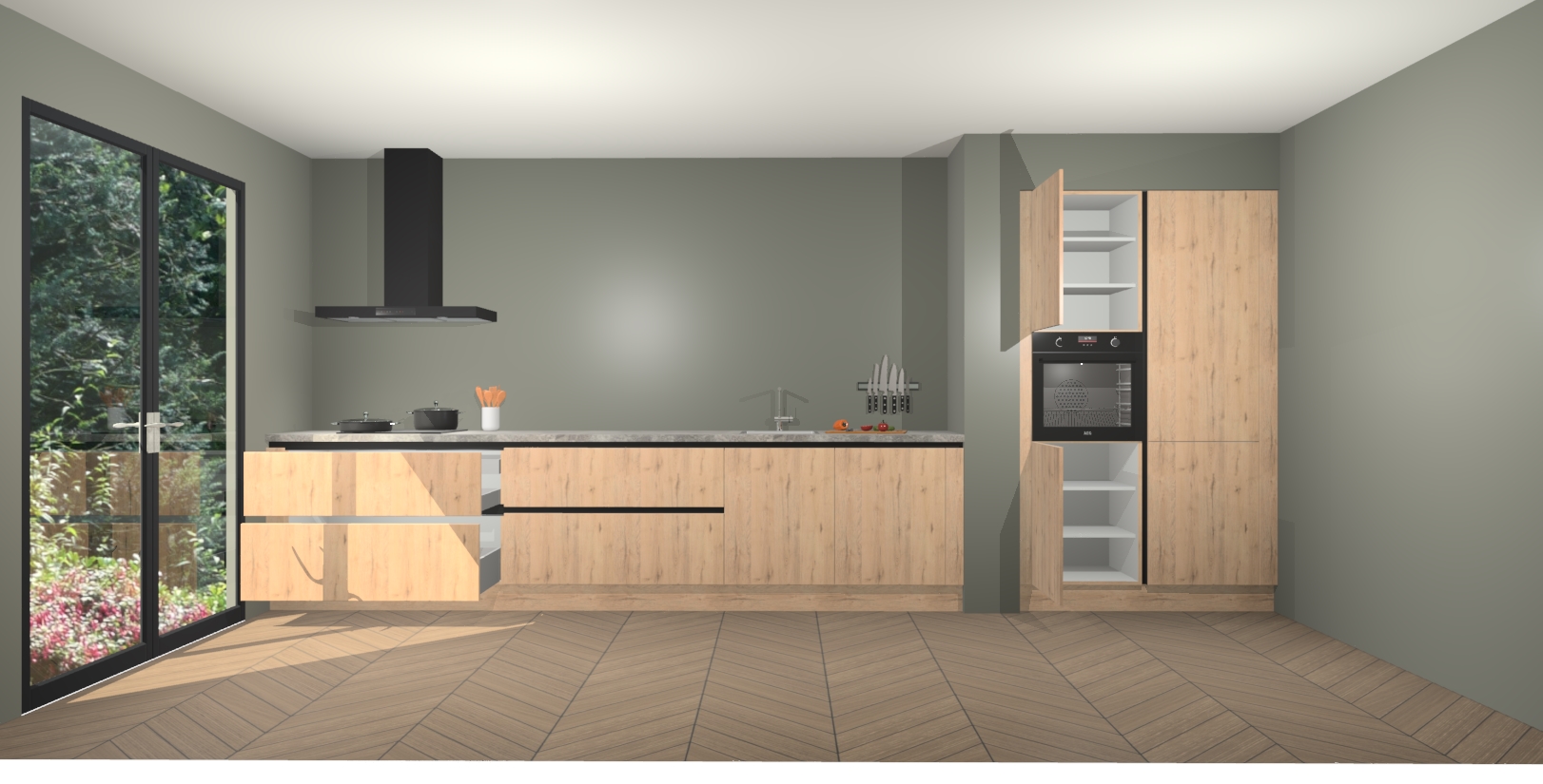 Met de Madera Natuur greeploze keuken Calgary Maakt u van uw keuken het pronkstuk van uw huis. Stijlvol en toch praktisch, de nieuwste look voor wie meer waarde en charme aan zijn huis wil toevoegen. Met prachtige handgrepen die zich lenen voor een klassieke stijlbron, zal u niet teleurgesteld zijn in het resultaat. De soft-close deurscharnieren geven een gevoel van luxe omdat ze zachtjes bewegen zonder storende of krakende geluiden te veroorzaken.